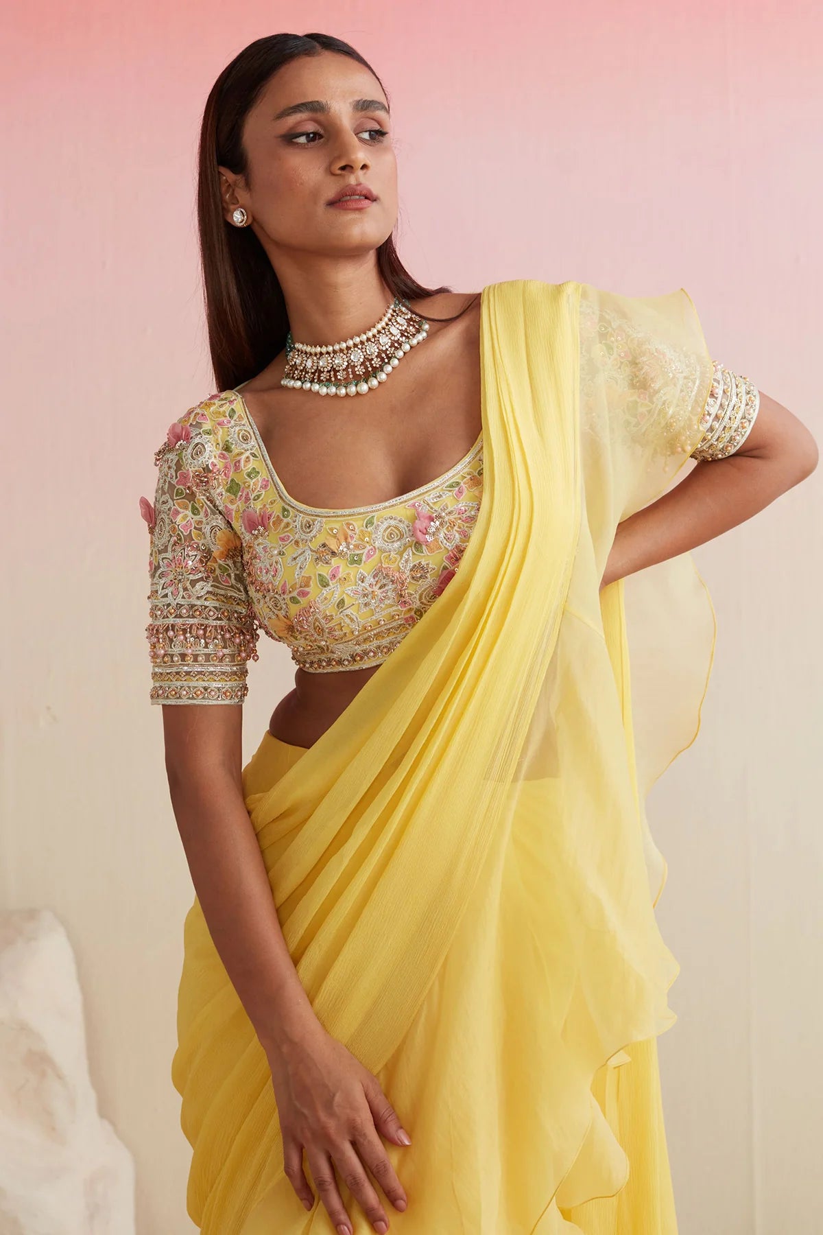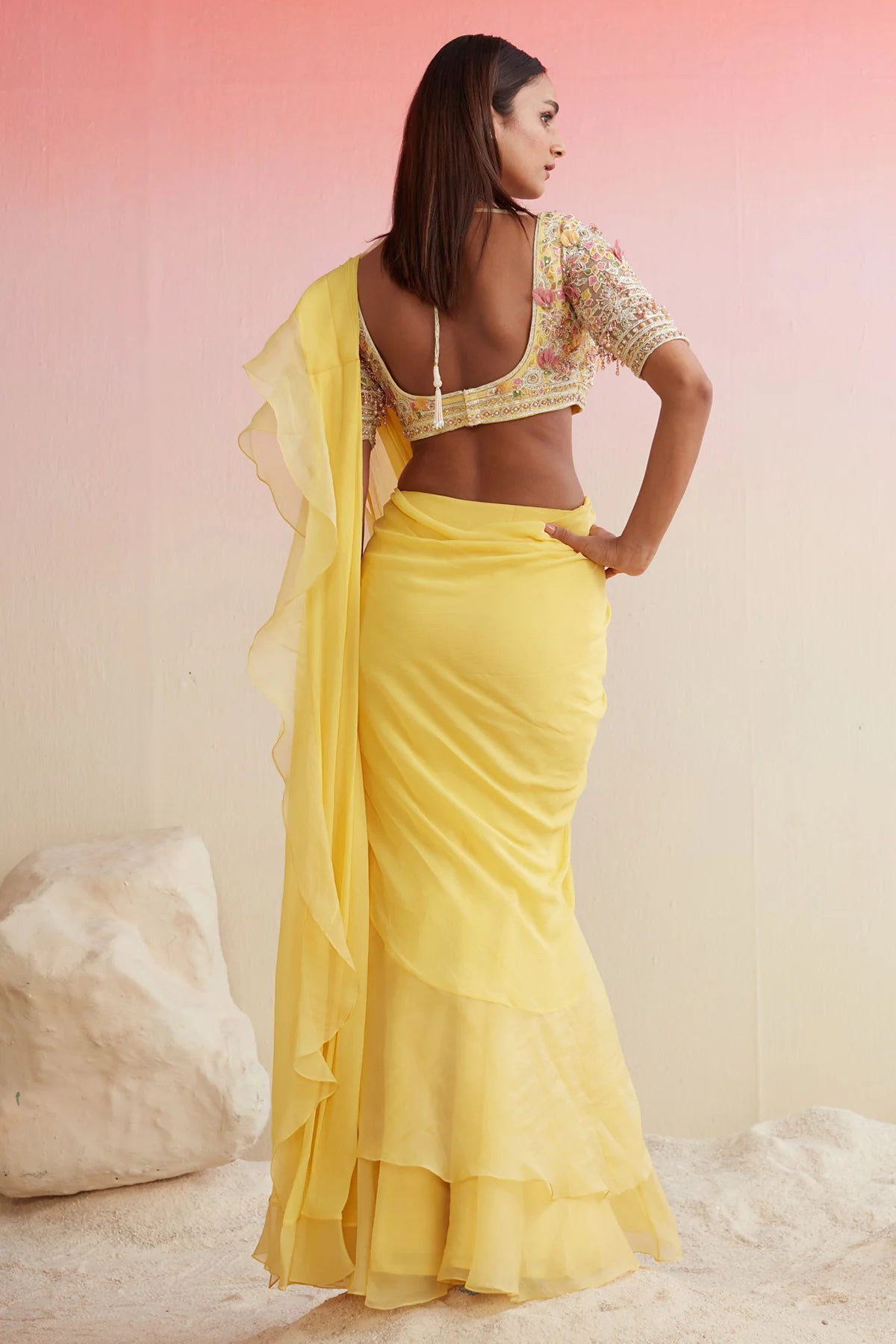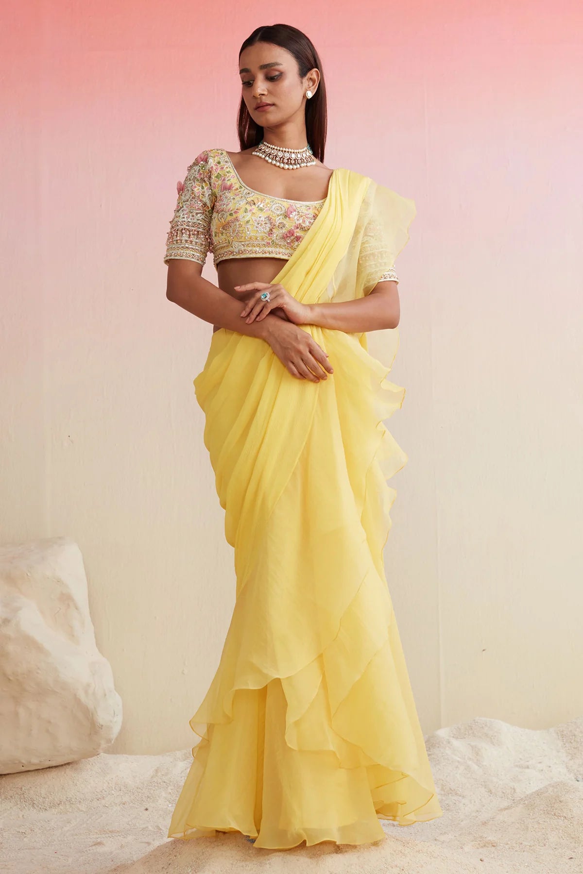 Yellow net embroidered blouse With Chiffon drape saree with organza ruffle