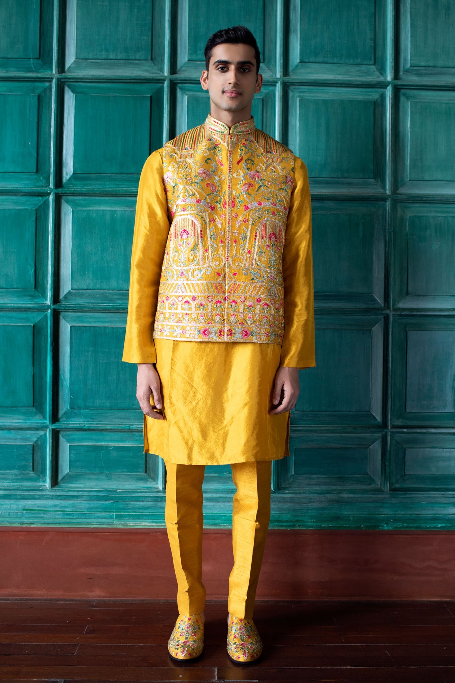- MUSTARD YELLOW, RAW SILK BANDI REPLETE WITH FLORAL AND FOLIAGE MOTIFS EMBROIDERED WITH MULTICOLORED SILK THREADS, AND TEAMED WITH A SILK KURTA AND TROUSERS.