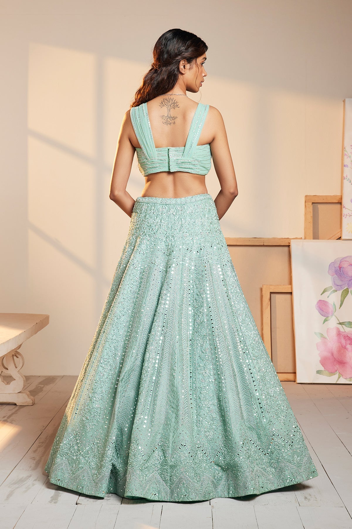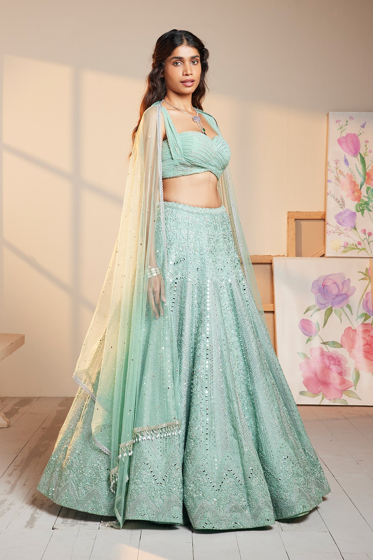 Organza-Base With Thread , Sequence And Mirror Embroidered Lehenga Paired With Sequence Embellished Ruched Blouse And Tulle Dupatta