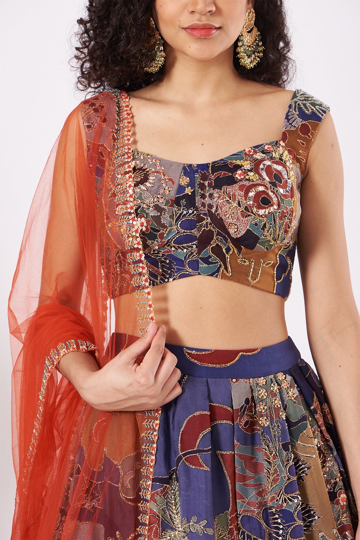 Blue paper dolls organza printed and embellished top and skirt with scallop dupatta