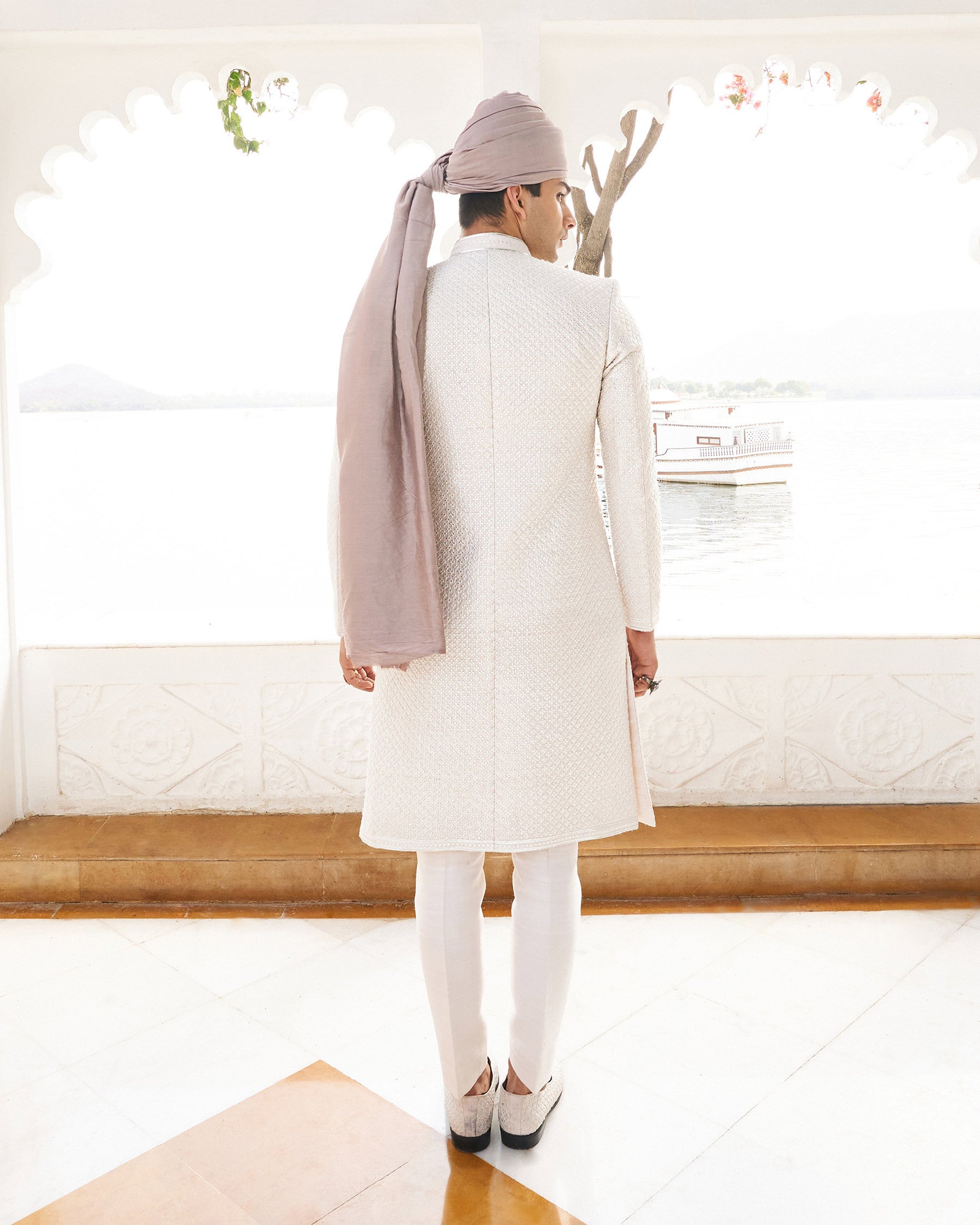 - RAW SILK CHROME APPLIQUE SHERWANI TEAMED WITH SILK TROUSERS.