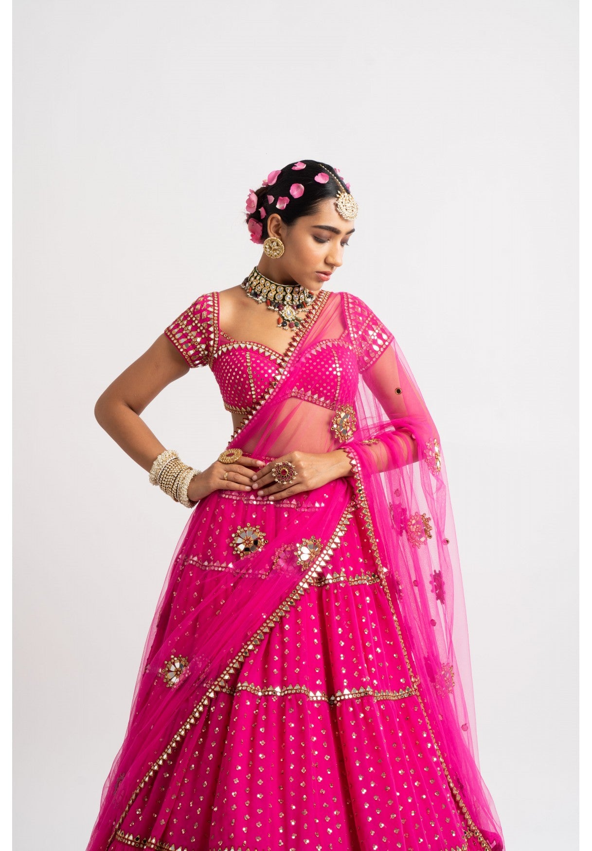 Sequins splash multi tier lehenga with sweetheart neckline hand embroidered blouse and a round mirror boota net dupatta.