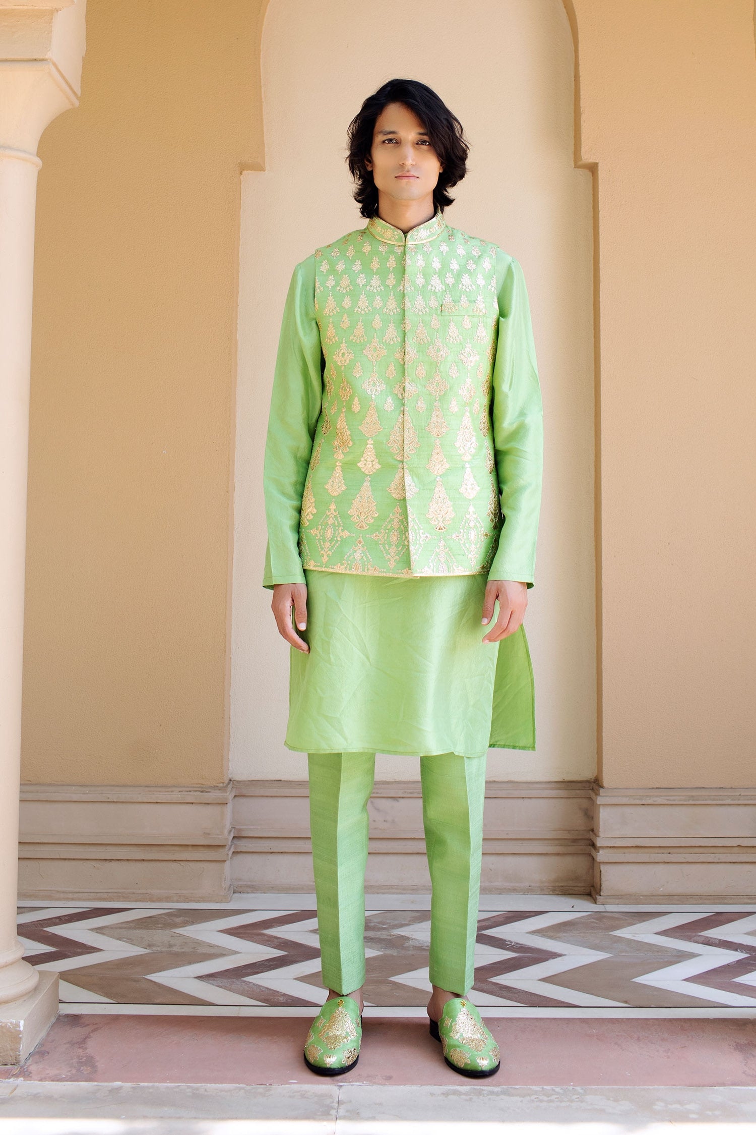 • LIGHT GREEN, RAW SILK, CHROME APPLIQUE BANDI ADORNED WITH ETHNIC MOTIFS, AND TEAMED WITH A SILK KURTA AND TROUSERS.