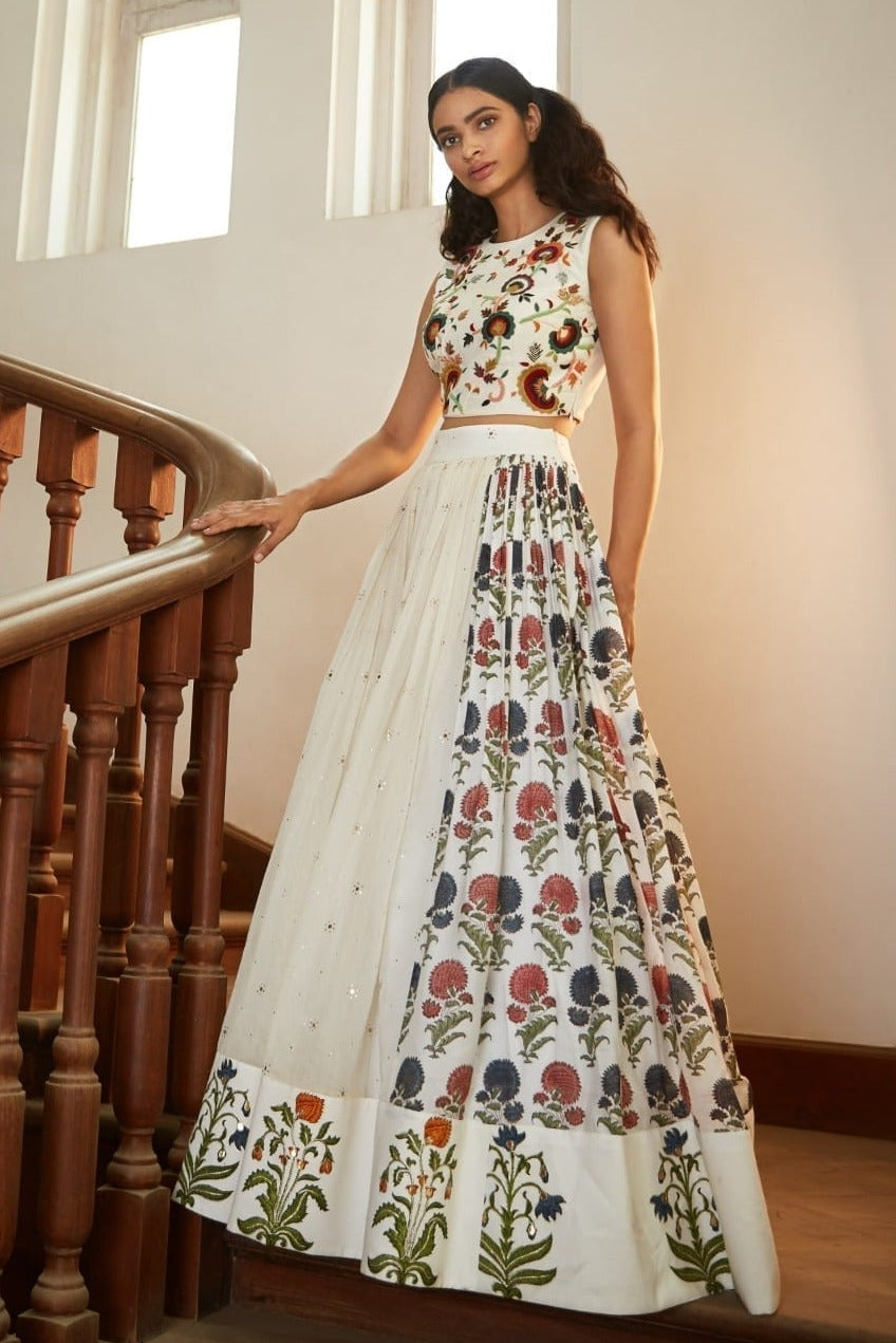 Label Anushree : Hand embroidered croptop with a high waisted badla work skirt & block printed panels.