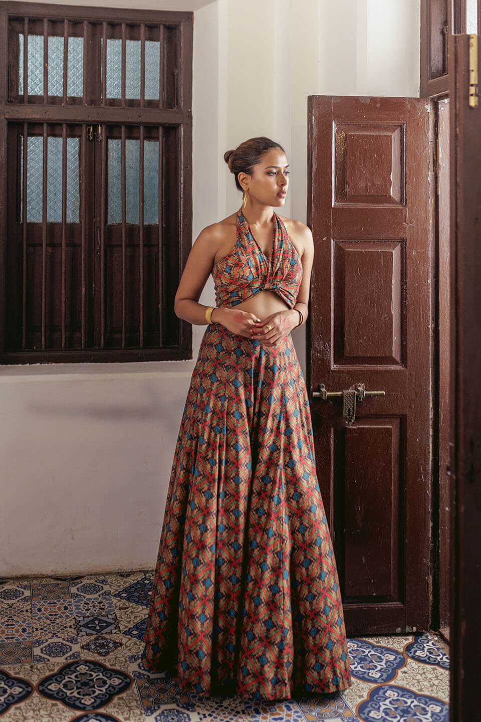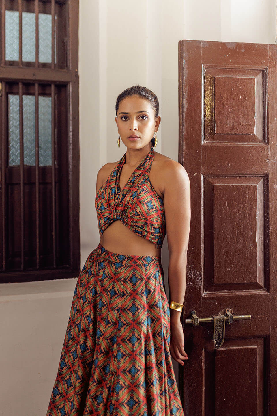 Draped Halter croptop teamed with printed flared pants in an easy sillhoute and a vibrant print