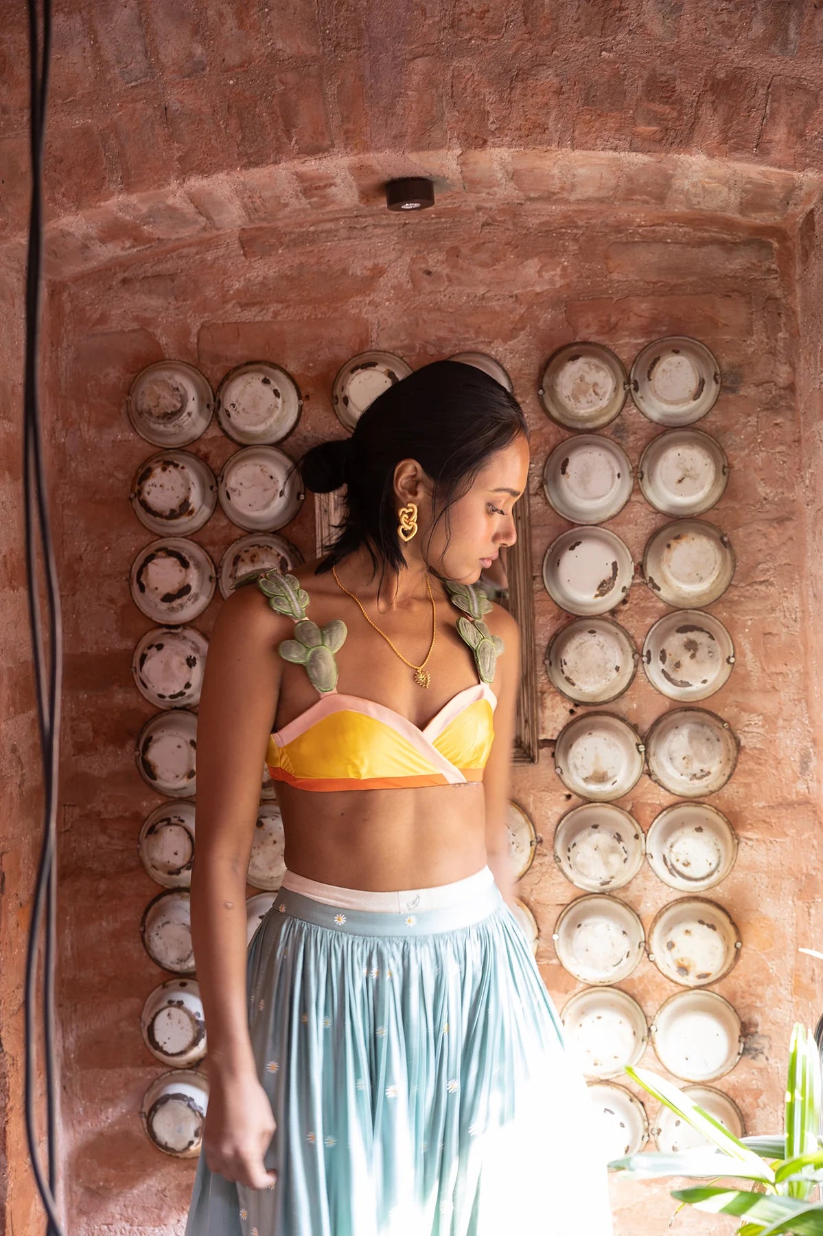 Bralette - Handwoven silk in Poppins yellow and orange. Hand embroidered cacti. Lego straps.