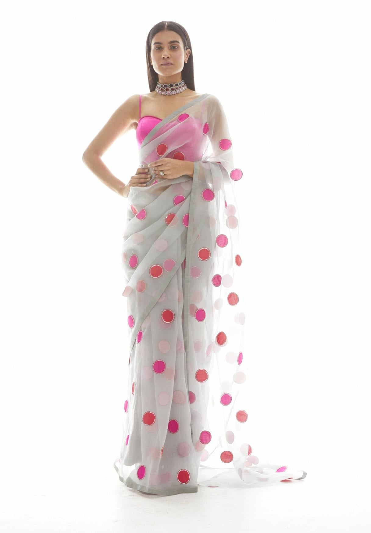 Light grey applique organza saree set