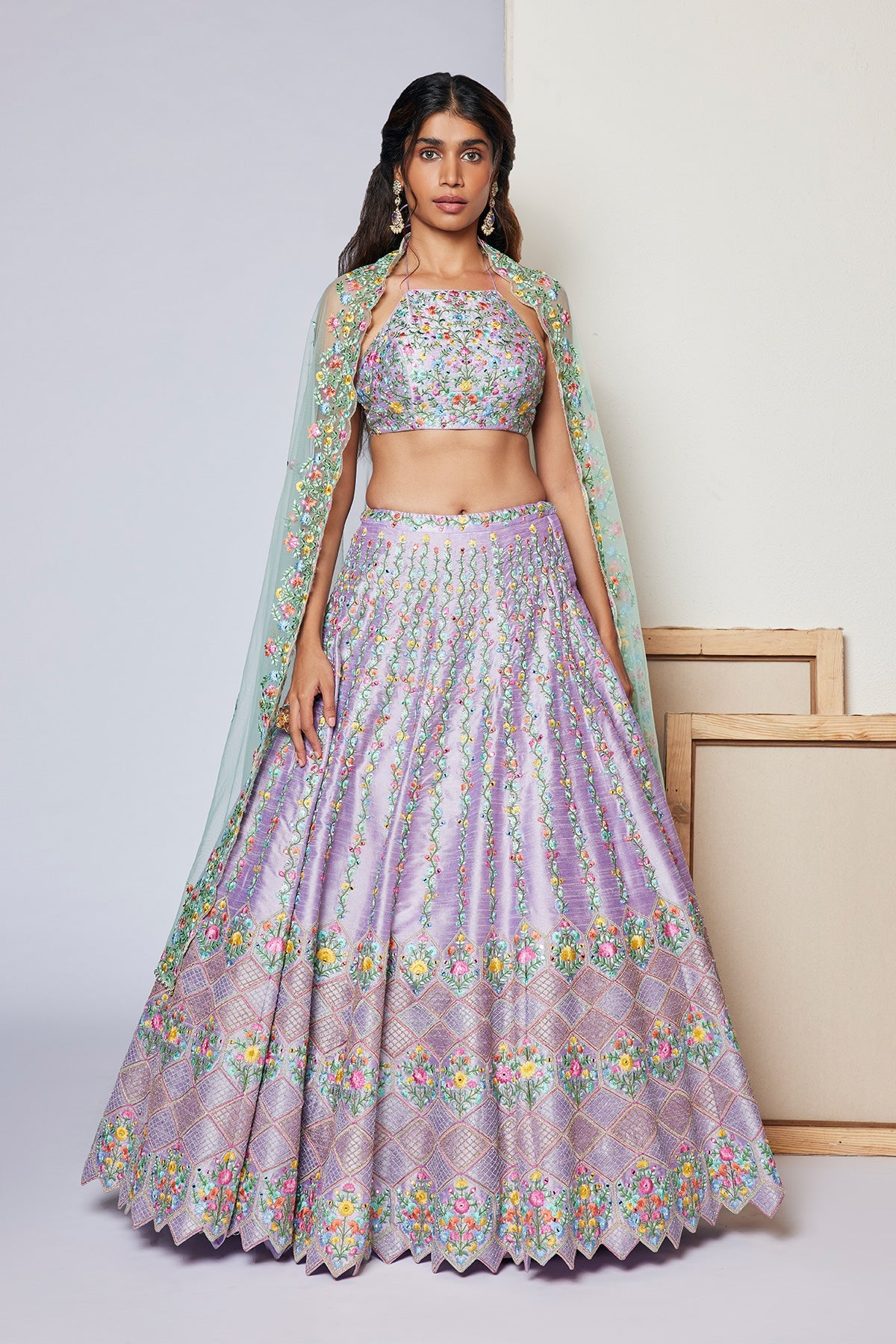 Silk Based Multi-Hued Thread And Mirror Embroidered Lehenga Paired With Matching Halter Blouse And Tulle Dupatta