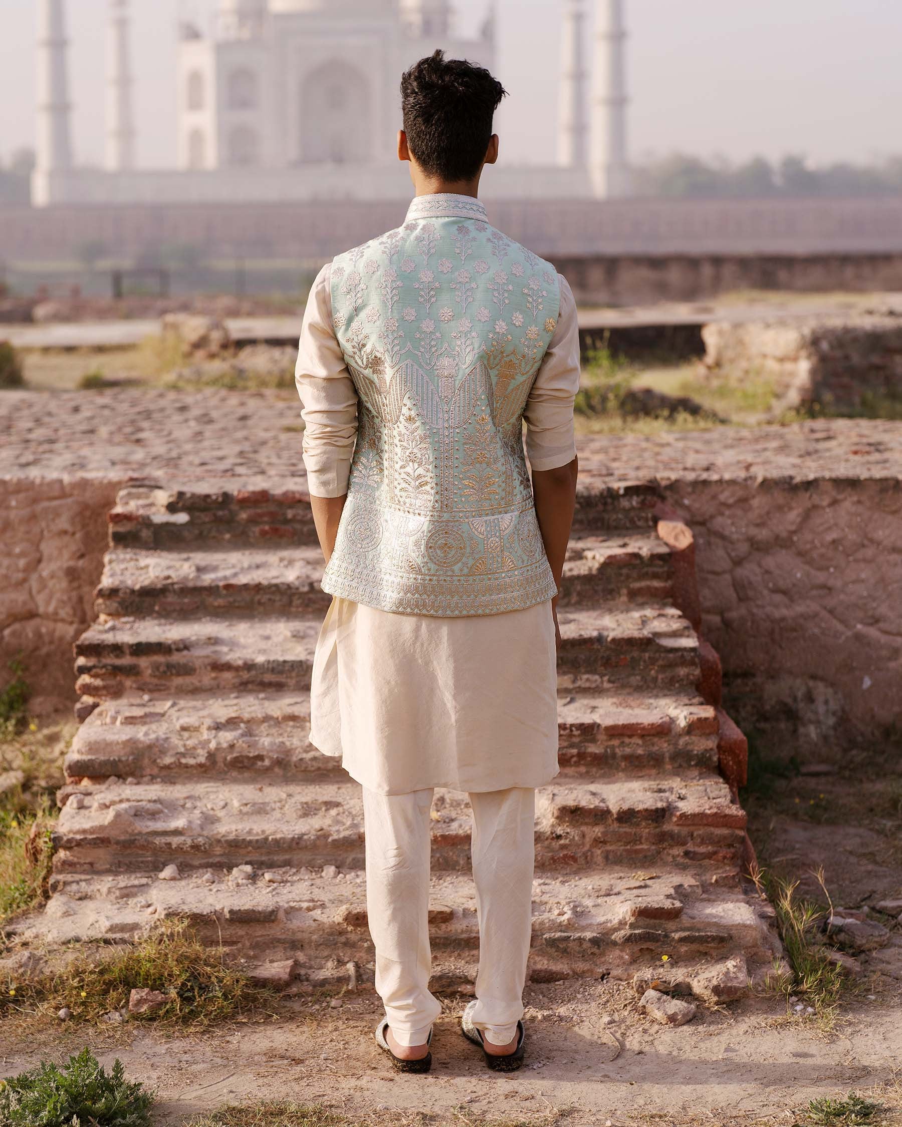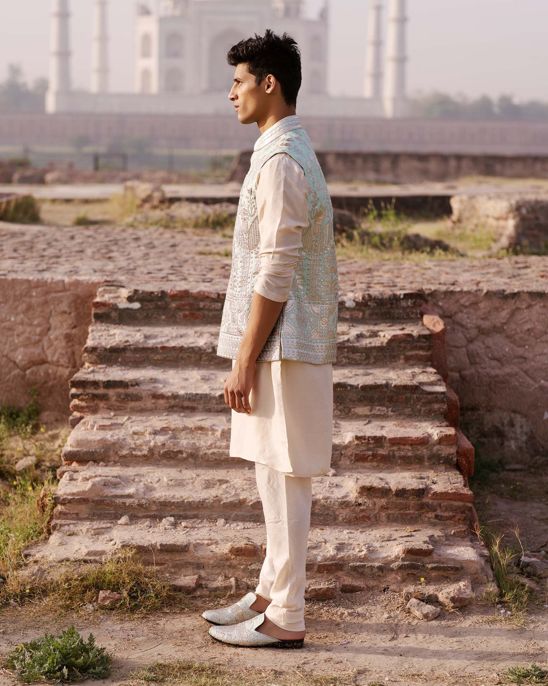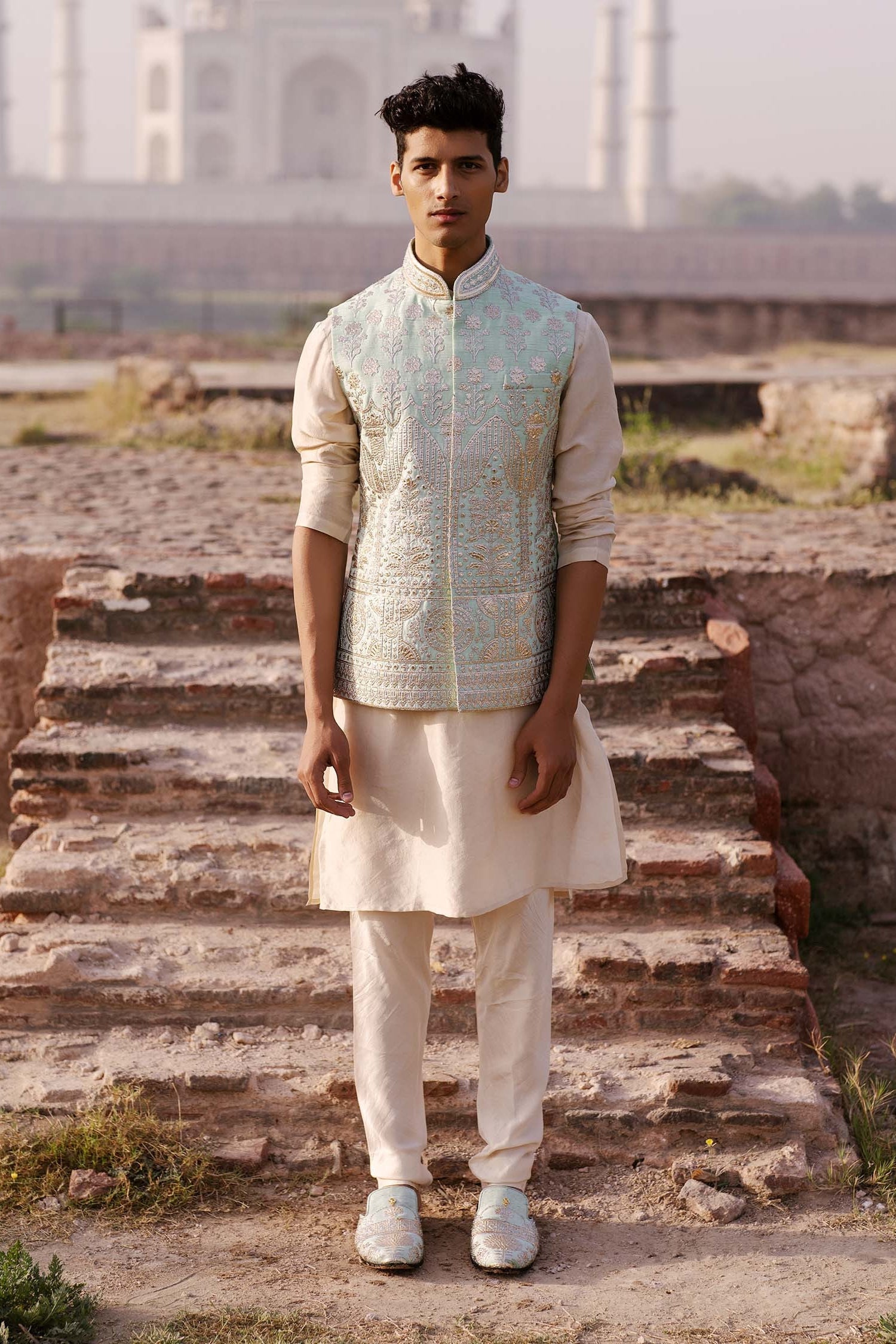 - FADED BLUE, RAW SILK BUNDI REPLETE WITH FLORAL AND ARCHITECTURAL MOTIFS IN CHROME APPLIQUE, AND TEAMED WITH A LIGHT BEIGE SILK KURTA AND TROUSERS