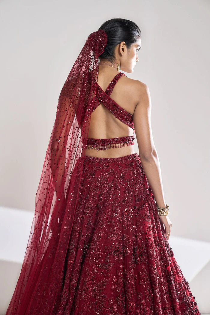 This maroon lehenga set features all over crystal, sequin and beads embroidery. The blouse has a plunging neckline, tassels at the waist and a criss cross back. It is paired with a matching embroidered net dupatta.