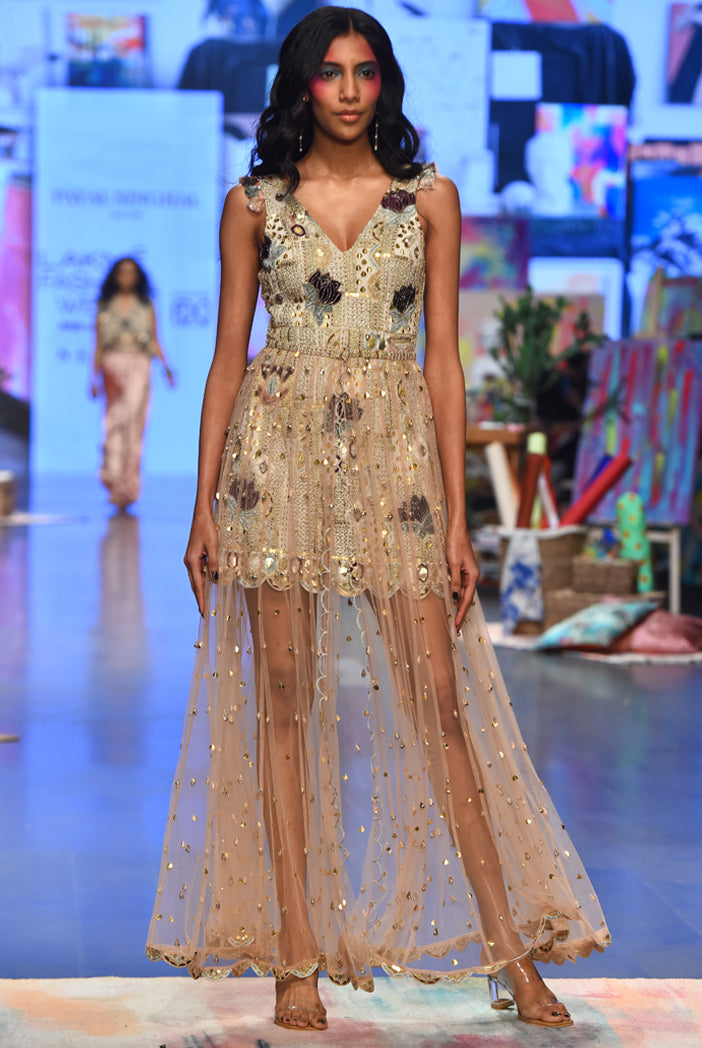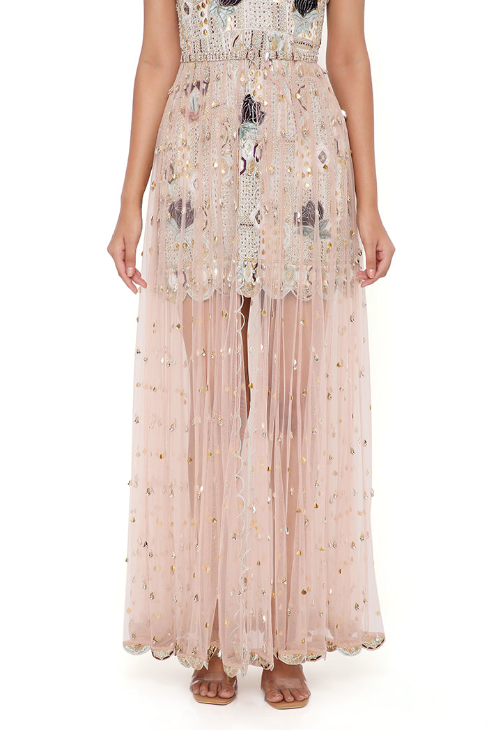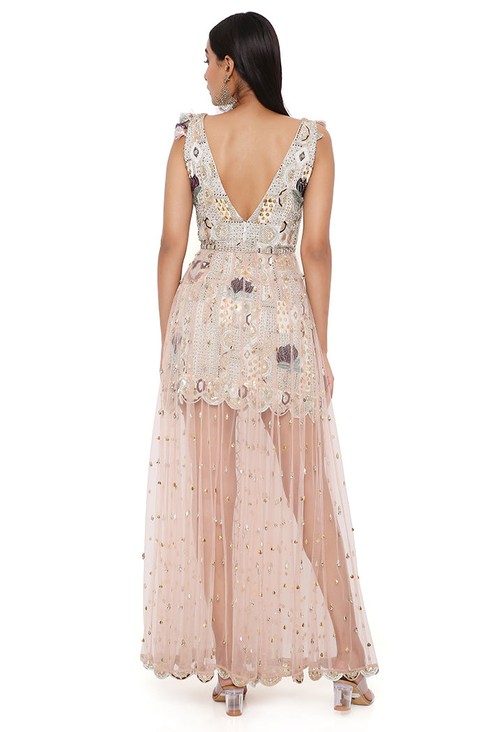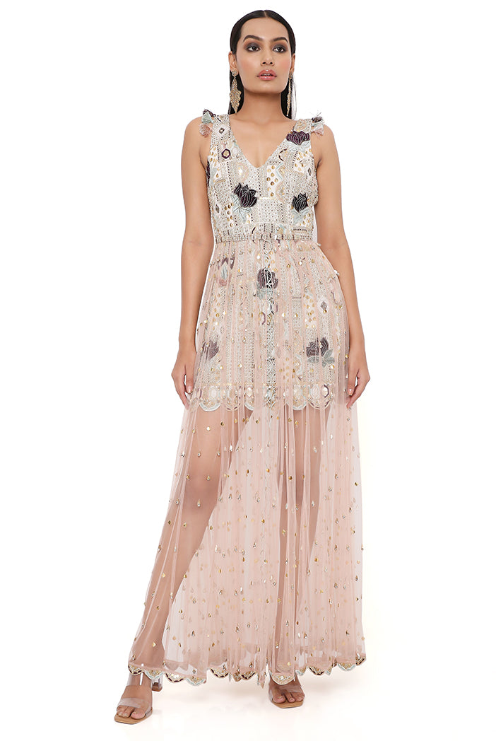 Mirai off white georgette embroidered dress with rose pink tulle net skirt