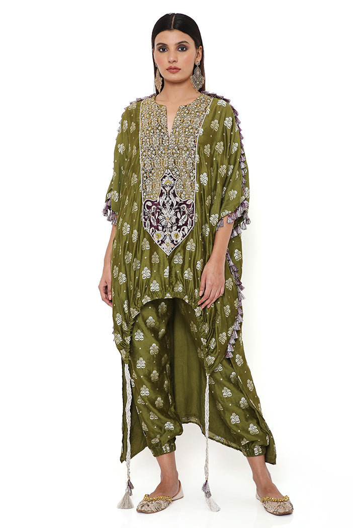 Olive banarasi high low kurta with jogger pants.