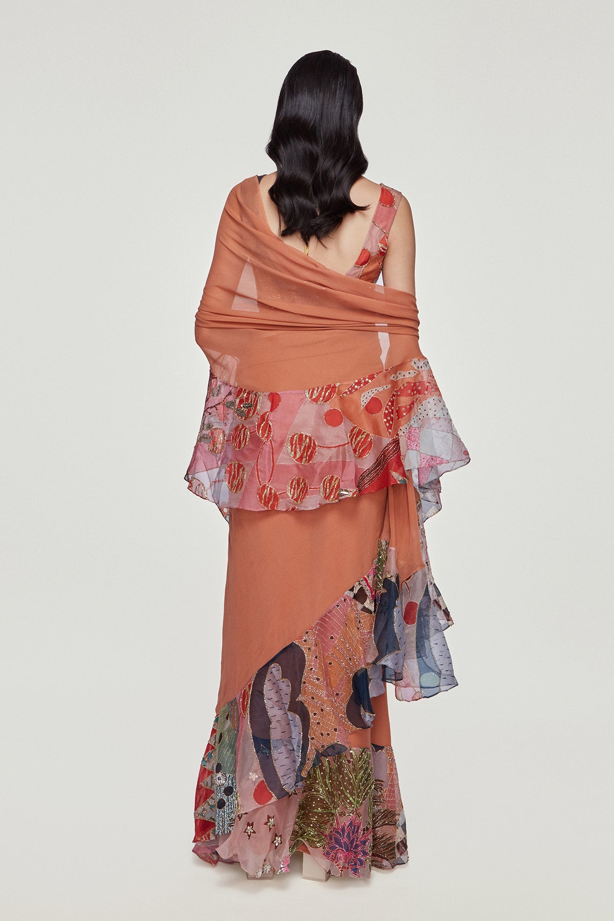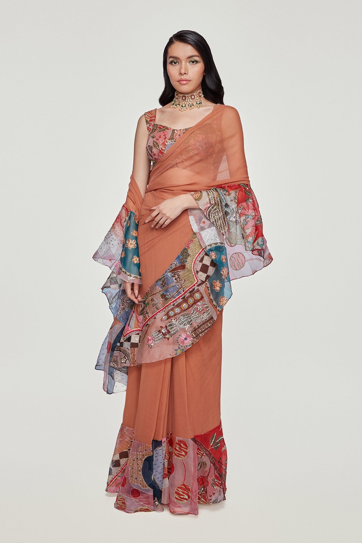 Amberina - orange divergence organza printed and embellished ruffle saree and blouse.