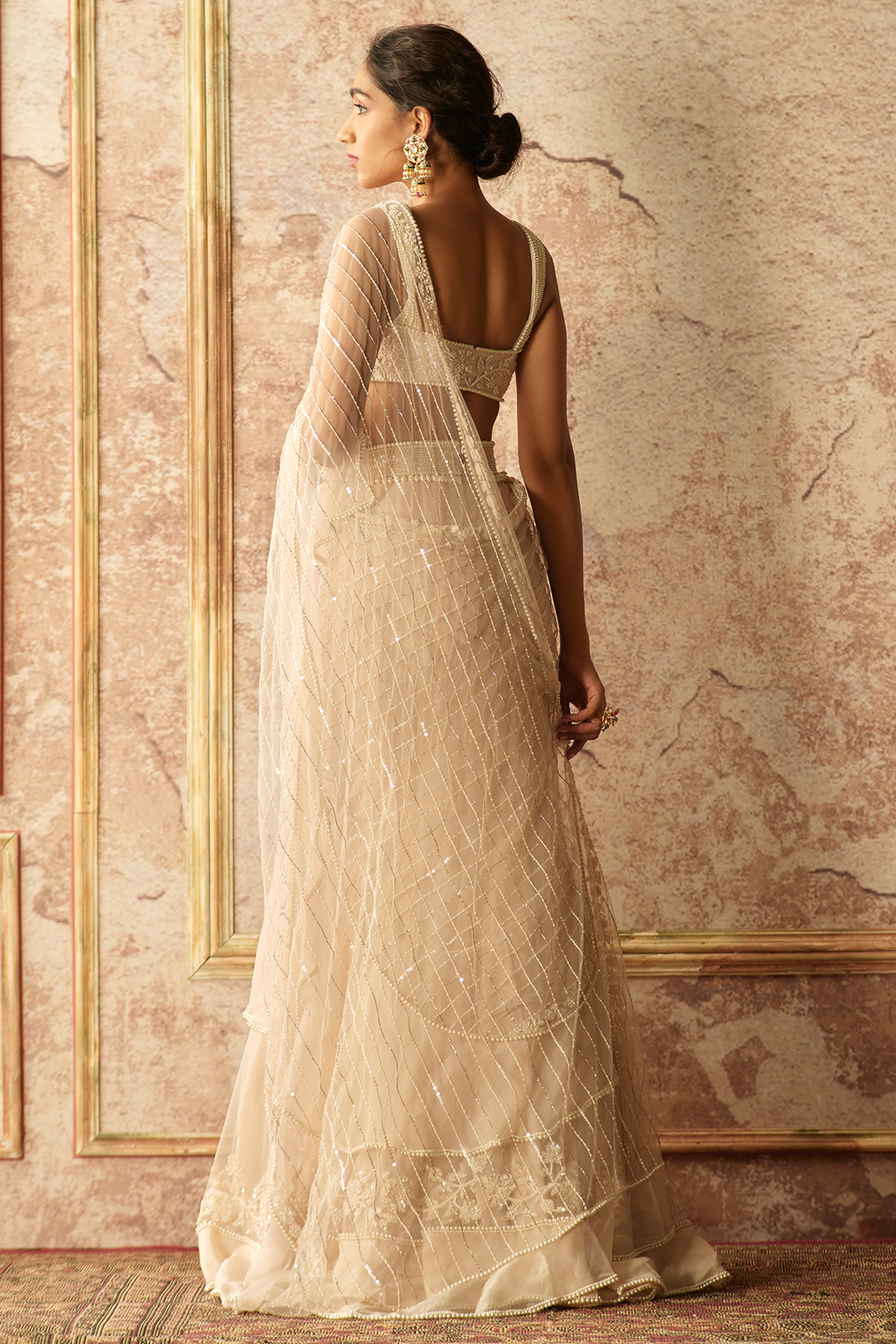 Dusty ivory net embroidered blouse and draped ruffle saree paired with pearl embroidered belt.