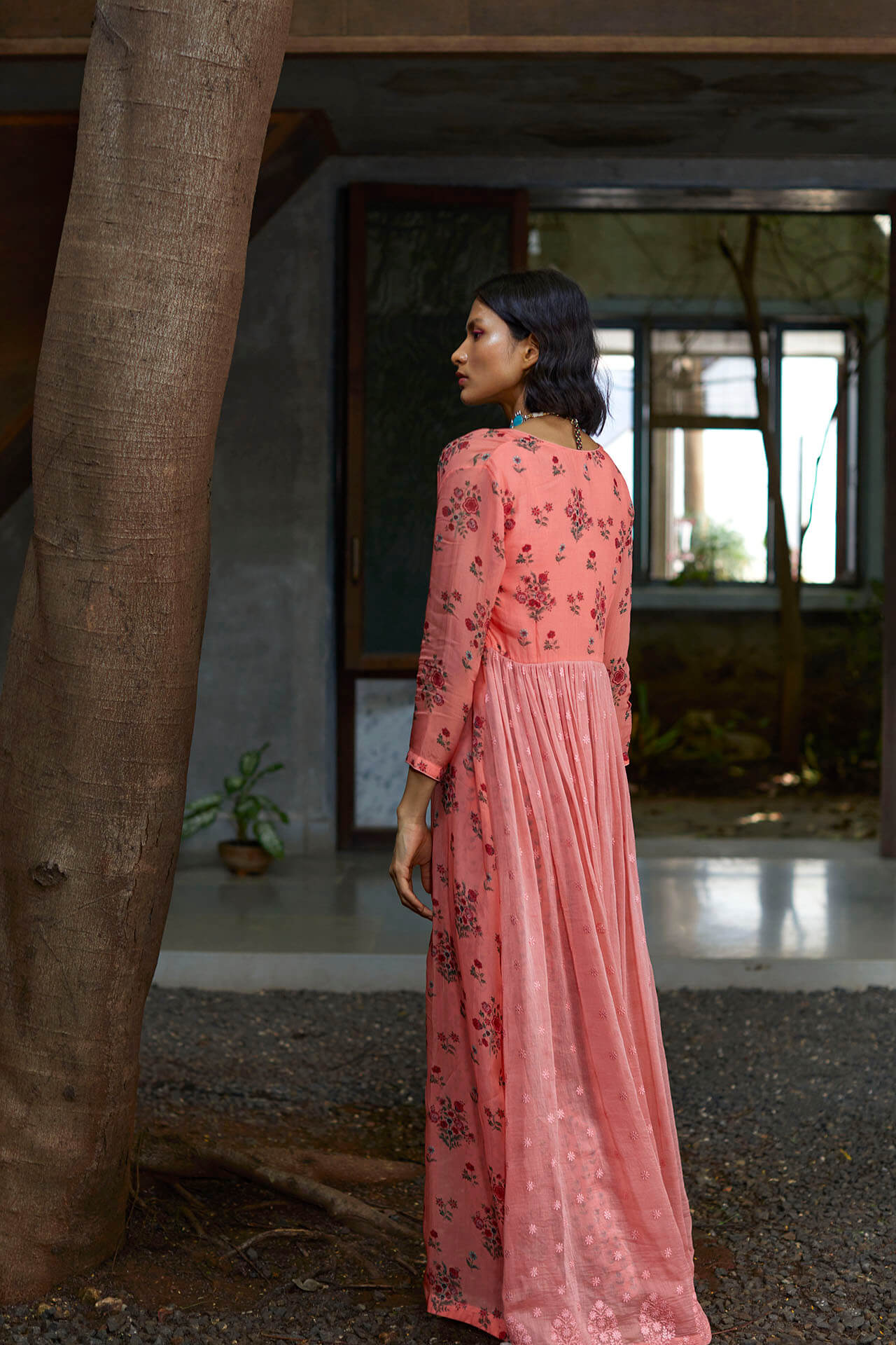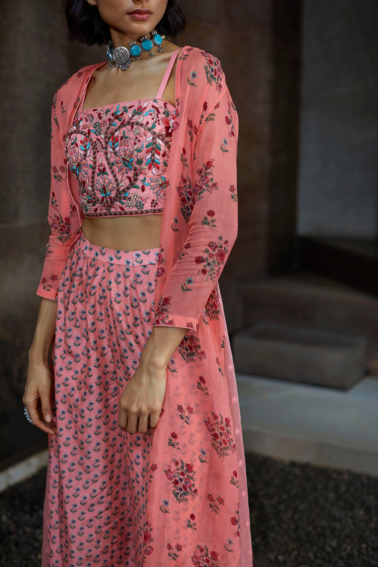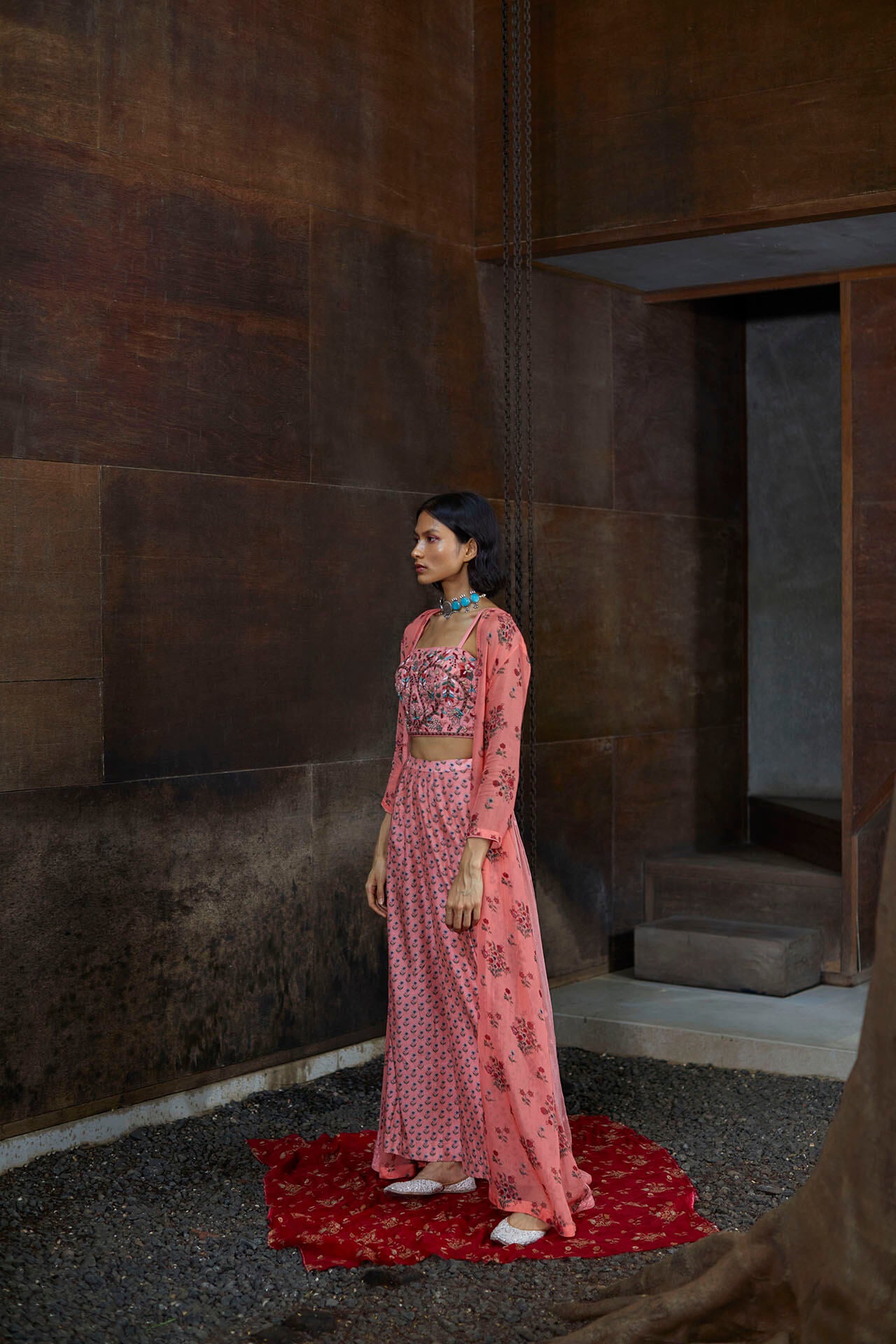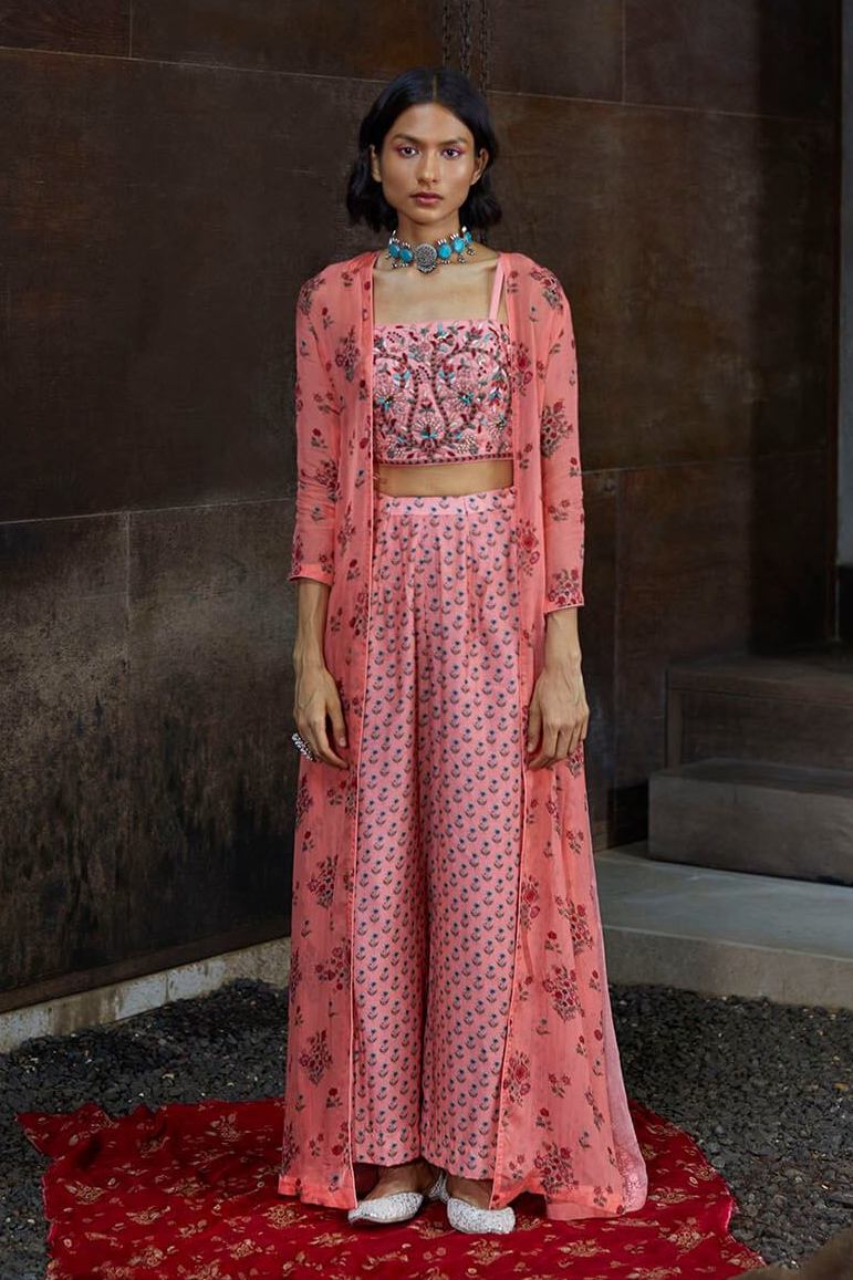 Label Anushree: Peach printed cape with threadwork on the back teamed with a hand embroidered bustier & printed pants