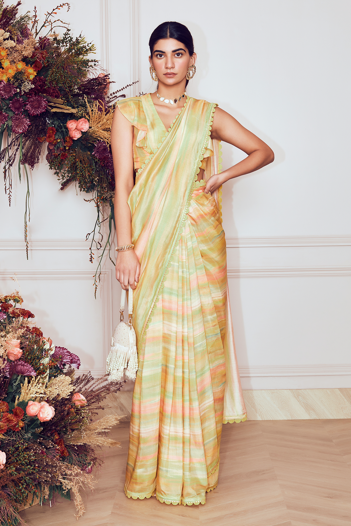 Yellow green ombre printed silk saree with frilled sleeveless blouse and crepe petticoat
