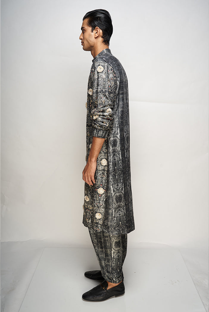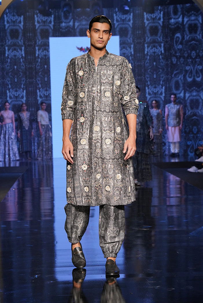 PS MEN YAZIR PRINTED DUPION SILK EMBROIDERED JOGGER KURTA WITH JOGGER PANTS