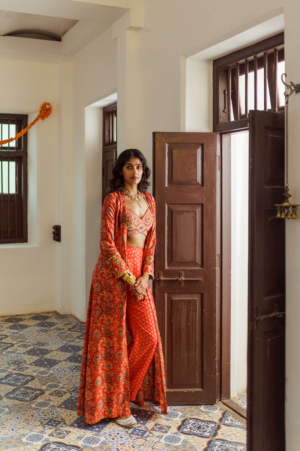 Hand beaded statement bustier teamed with printed pallazo and cape in fresh hues of red & floral.