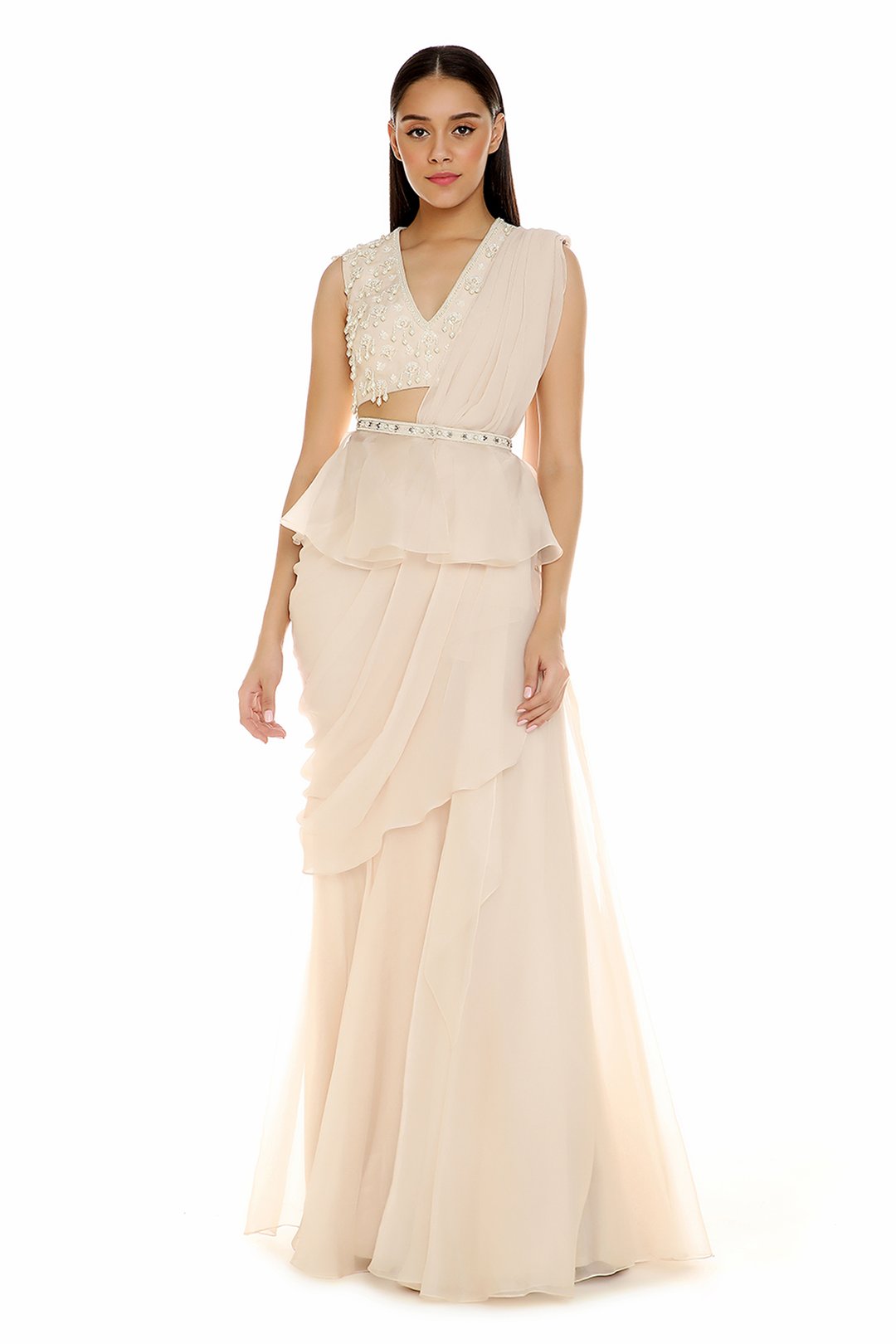 Ivory pearl detailed organza blouse and chiffon-organza draped ruffle saree paired with pearl embroidered organza peplum belt.