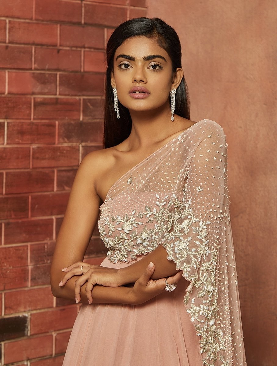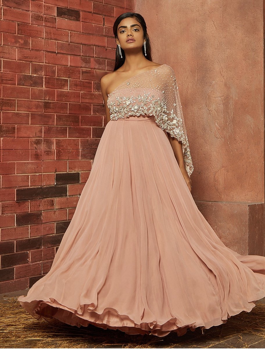 Soft pink georgette tube gown with a net drape hand embellished with pearl & bead work