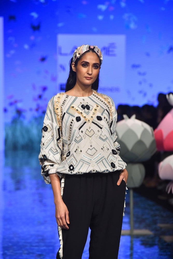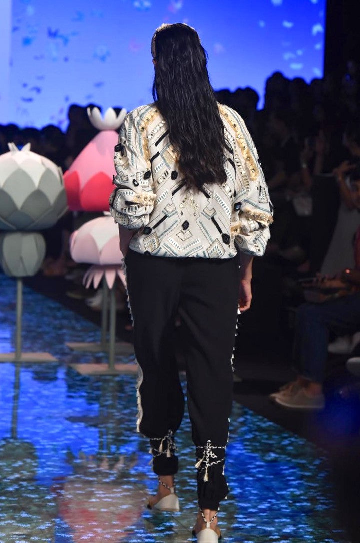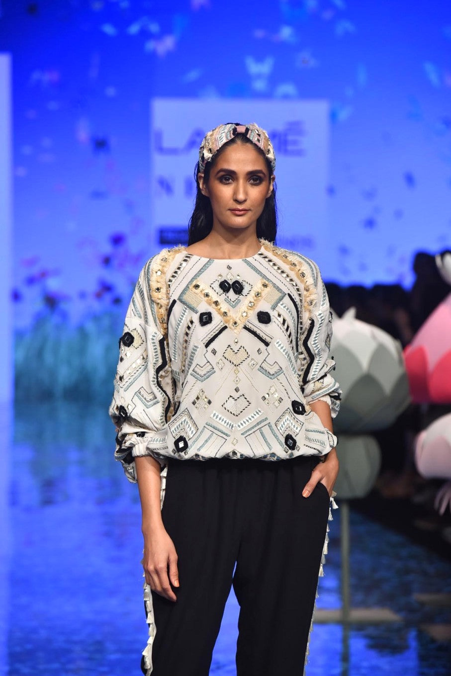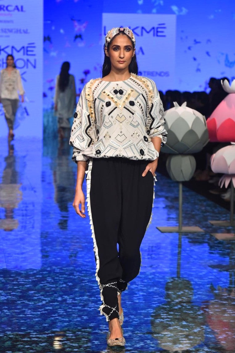 Designer Payal Singhal: Chalk white embroidered georgette top paired with black tasseled pants
