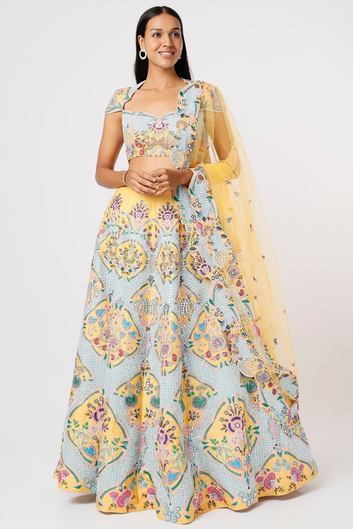 Yellow paper dolls raw silk appliquéd and embellished lehenga with blouse and cutwork dupatta