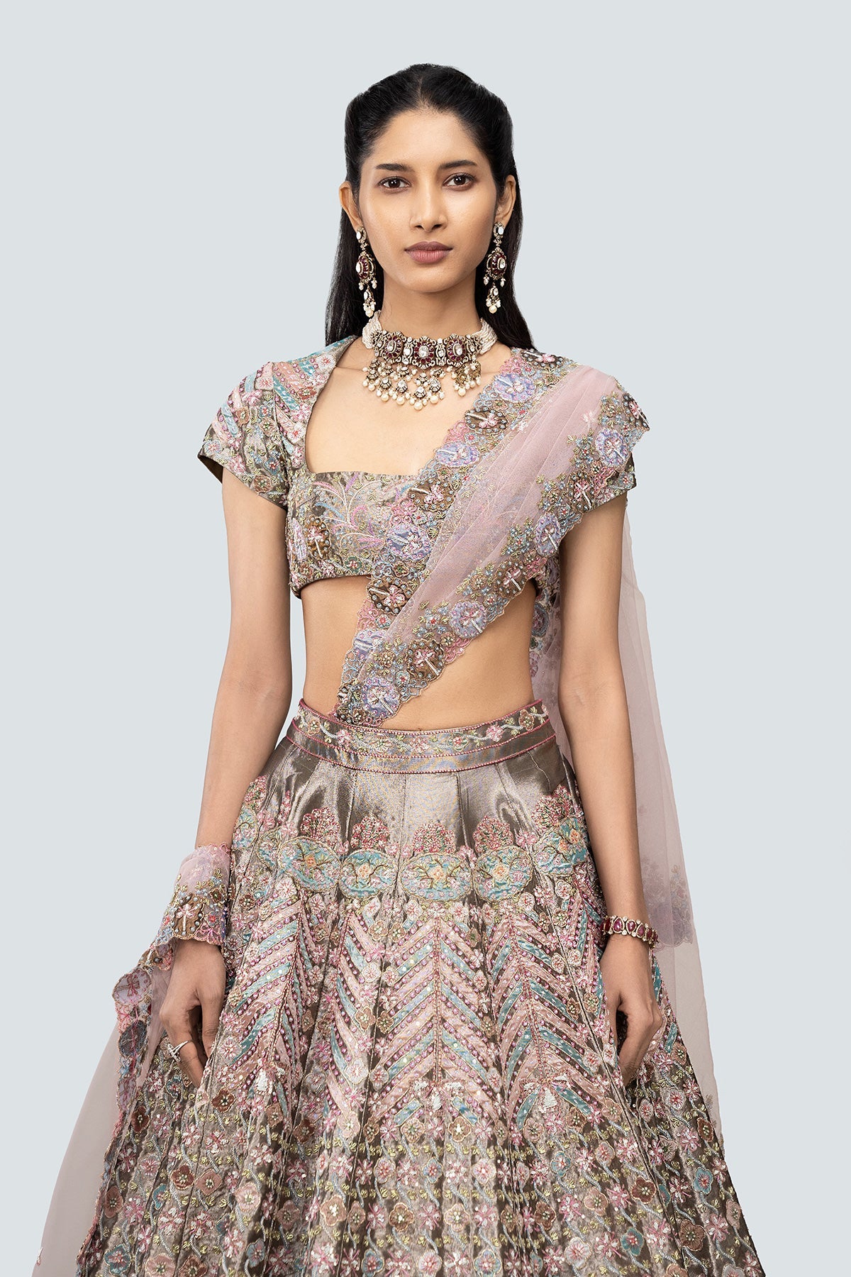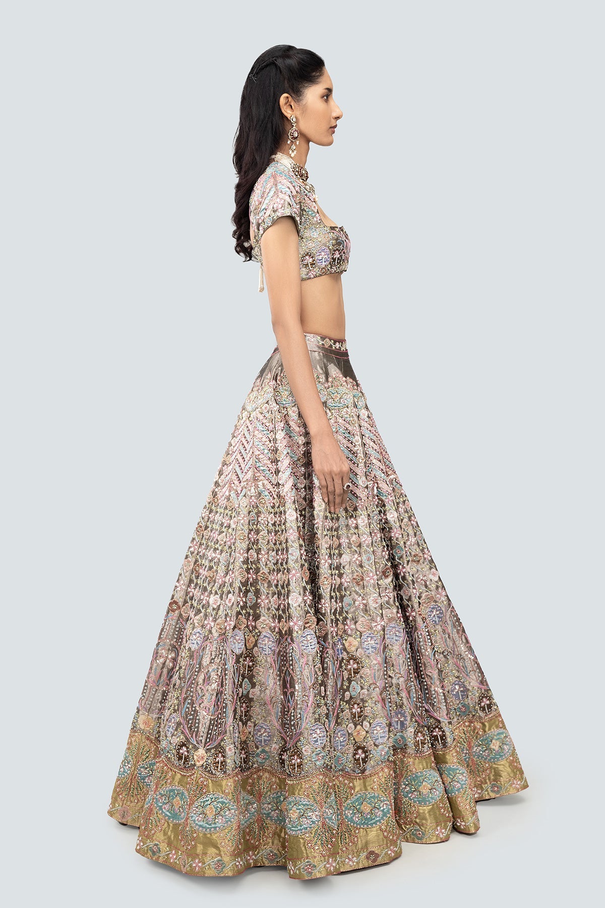 Multicoloured heavy embellished and applique kali tissue lehenga with blouse & net dupatta.
