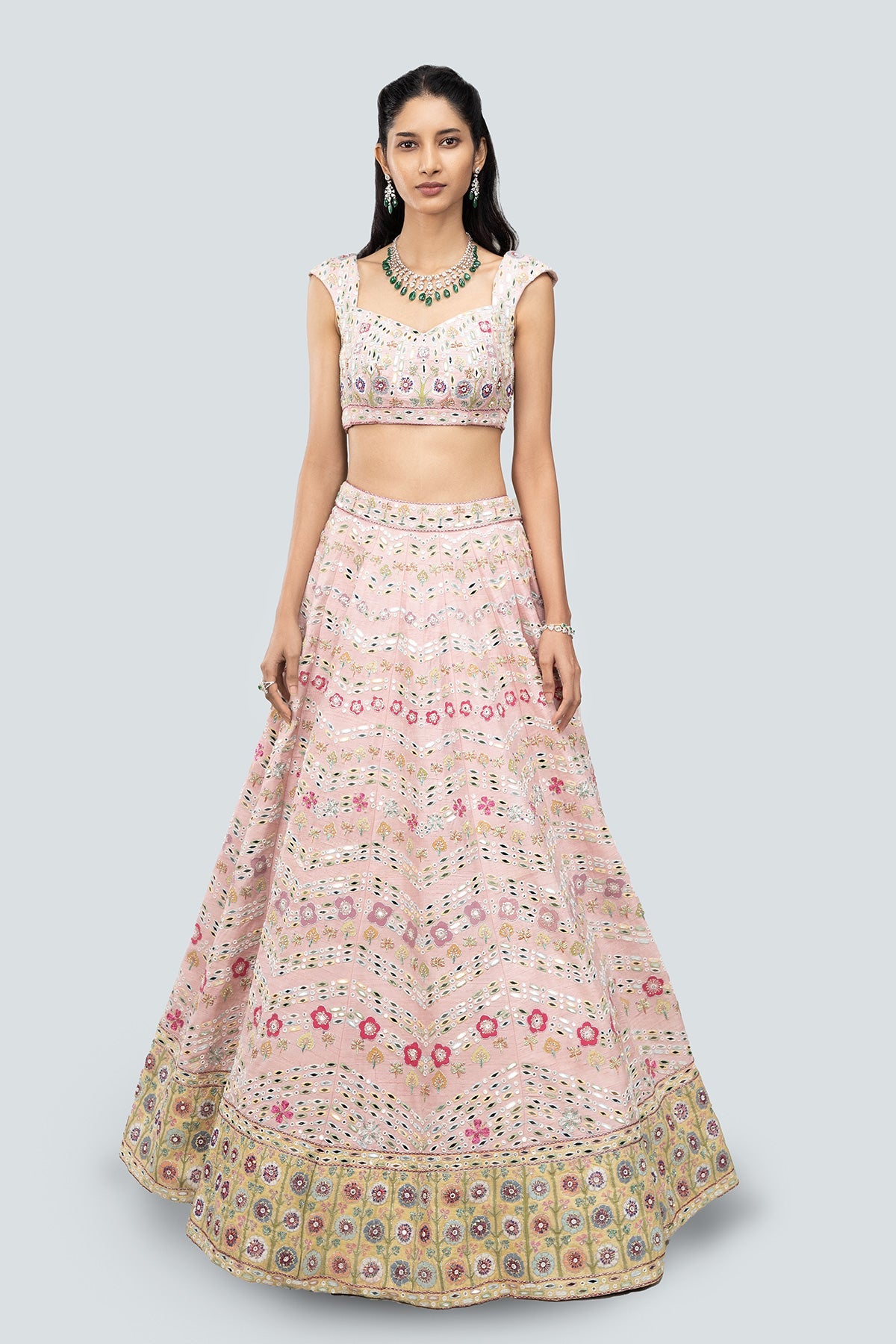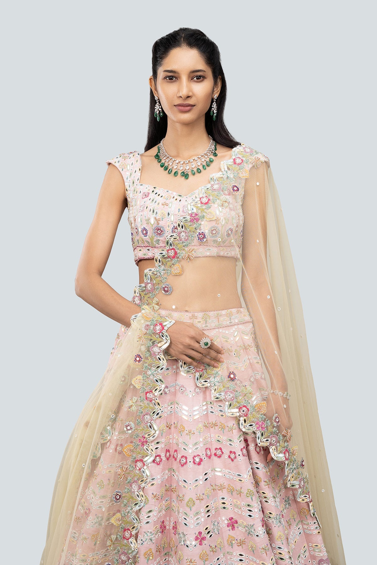 Embellished heavy kali raw silk mirror lehenga with sleeveless blouse and cutwork border dupatta.
