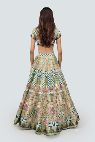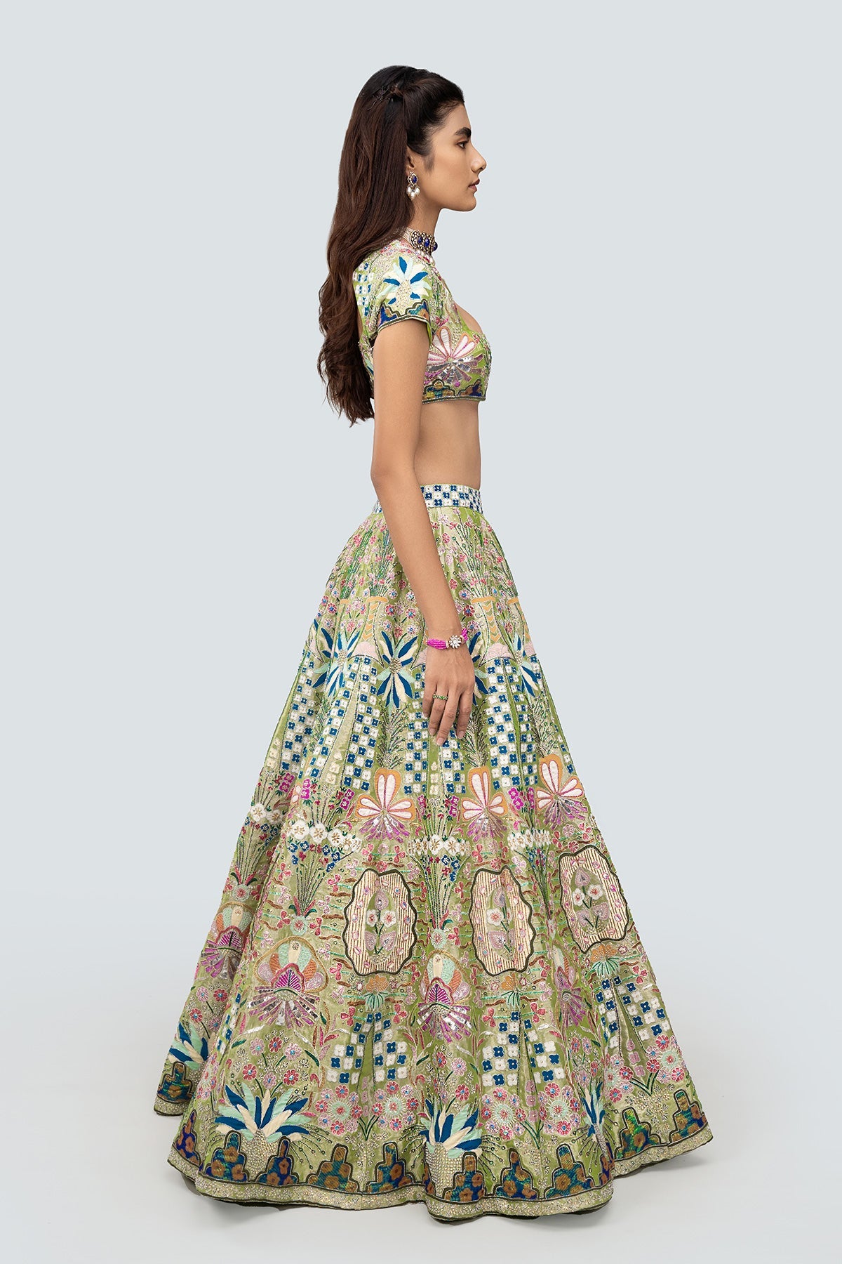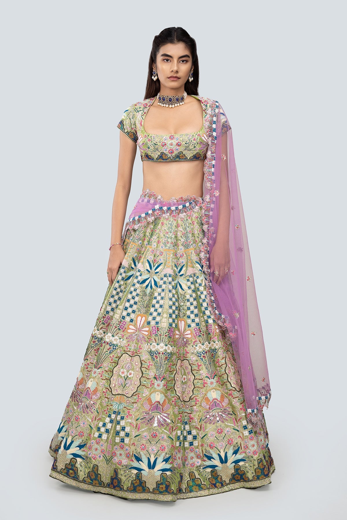 Multicoloured green heavy embellished and applique kali tissue lehenga with blouse and scallop net dupatta.
