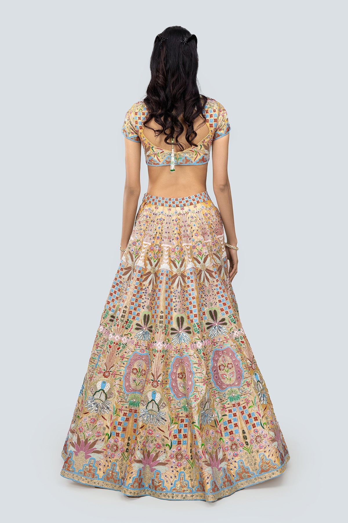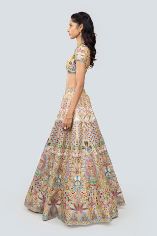Multicoloured heavy embellished and applique kali tissue lehenga with blouse and scallop net dupatta.