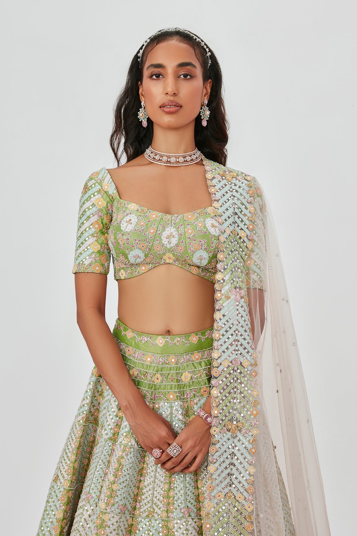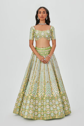Lime-pastel heavy embellished kali Tissue lehenga with broad lehenga border ,blouse & broad border dupatta.