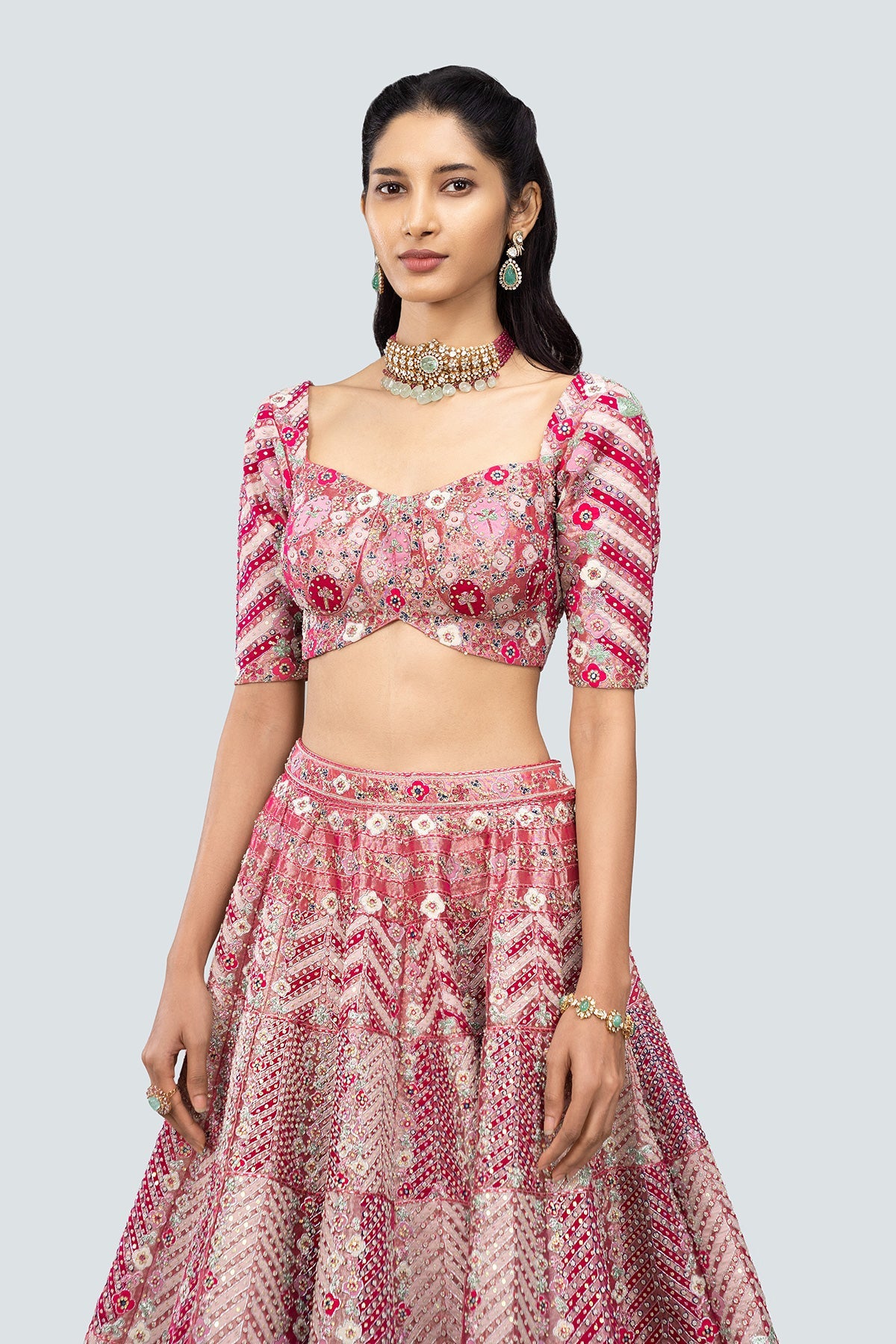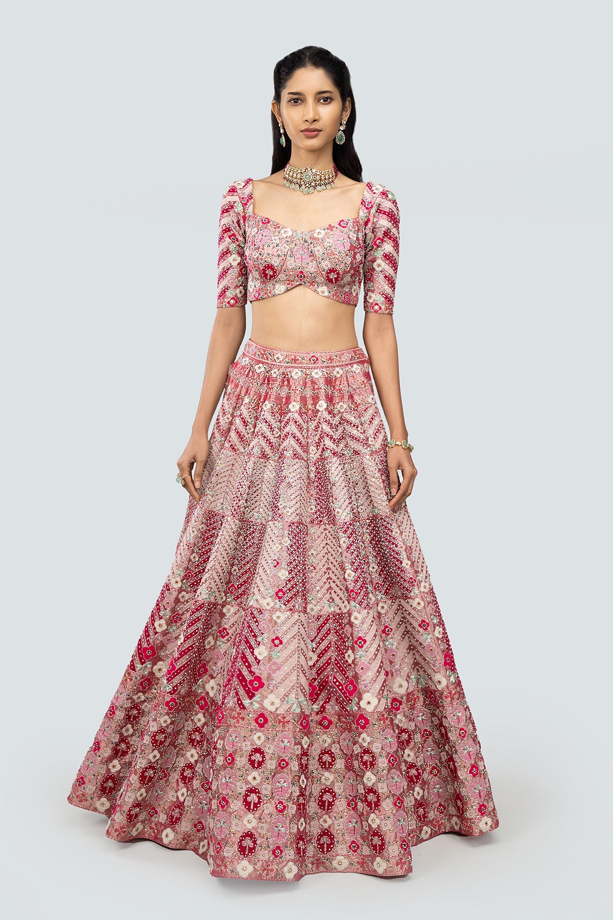 Applique and embellished heavy kali mirror work tissue lehenga with blouse and border net dupatta.