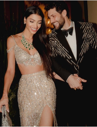 • Sequin champagne-coloured ensemble from the shelves of Falguni Shane Peacock. The attire features a high slit skirt with a bralette set in noodle strap and a plunging neckline.