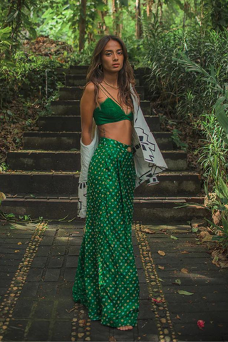 Trousers - Vintage pleat, high - waist handwoven, hand - dyed silk bandhini trousers. Bralette - Lots of sexy straps, lace and silk bralette. Jacket - Oversized, handwoven silk, hand embroidered with beaten gold of vintage indian motifs.