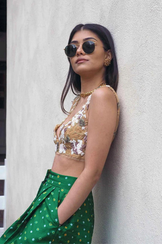 Crop - Nude tulle that creates an illusion of skin with a lace underlay, hand embroidered asters, lilacs, freesias with light gold floss, beads, and pearls. Skirt - Vintage pleat, high - waist handwoven, hand - dyed silk bandhini trousers with pockets
