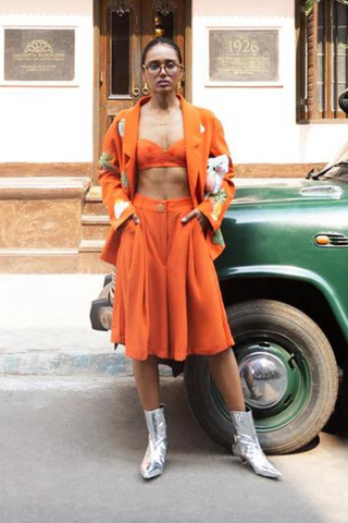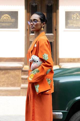 Jacket - Tangerine. Hand woven silk. Hand embroidered with the sun and her cloud, exotic cacti, punch drunk love pineapples, palm trees.