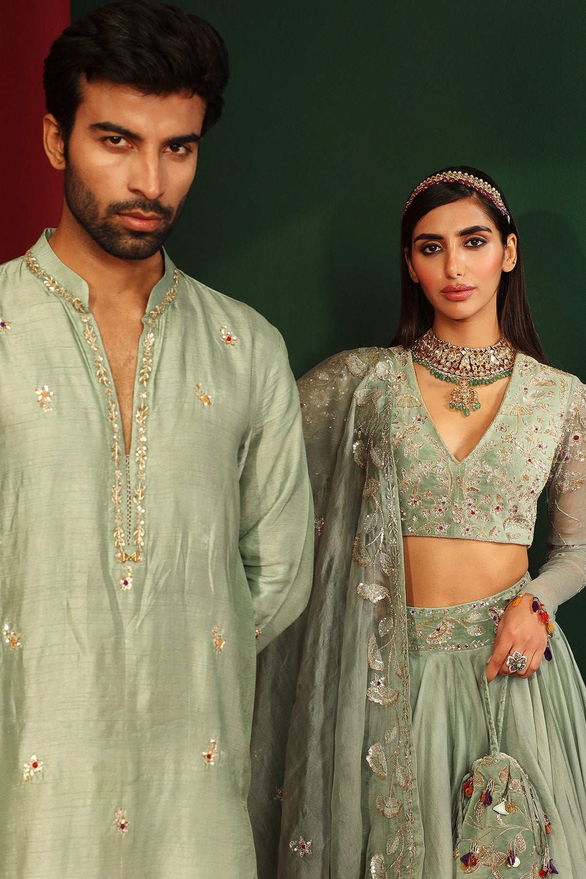 Jade embroidered Lehenga in organza, embroidered blouse and organza dupatta with hand made tassels