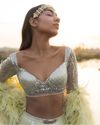 • PEPPERMINT GREEN LEHENGA WITH TRADITIONAL AND ARCHITECTURAL MOTIFS IN PRINTED CHROME APPLIQUE. THE LEHENGA SKIRT IS PAIRED WITH A HALF-SLEEVED, EMBROIDERED, CROPPED BLOUSE HAVING CRYSTALS, SEQUINS AND TASSELS; AND A LIGHT DUPATTA
