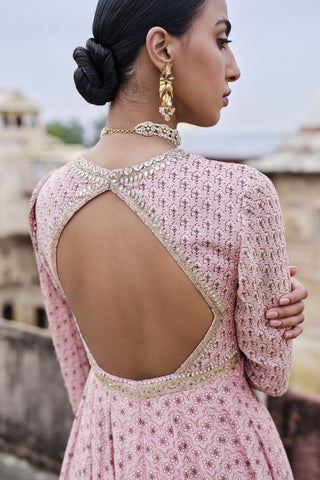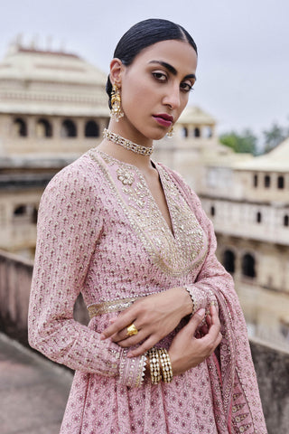 A soothing blush hue crafted in soft mul makes this anarkali set a timeless ensemble. Elevated in signature gota patti and zardozi embroidery, it weaves heritage with modernity effortlessly.