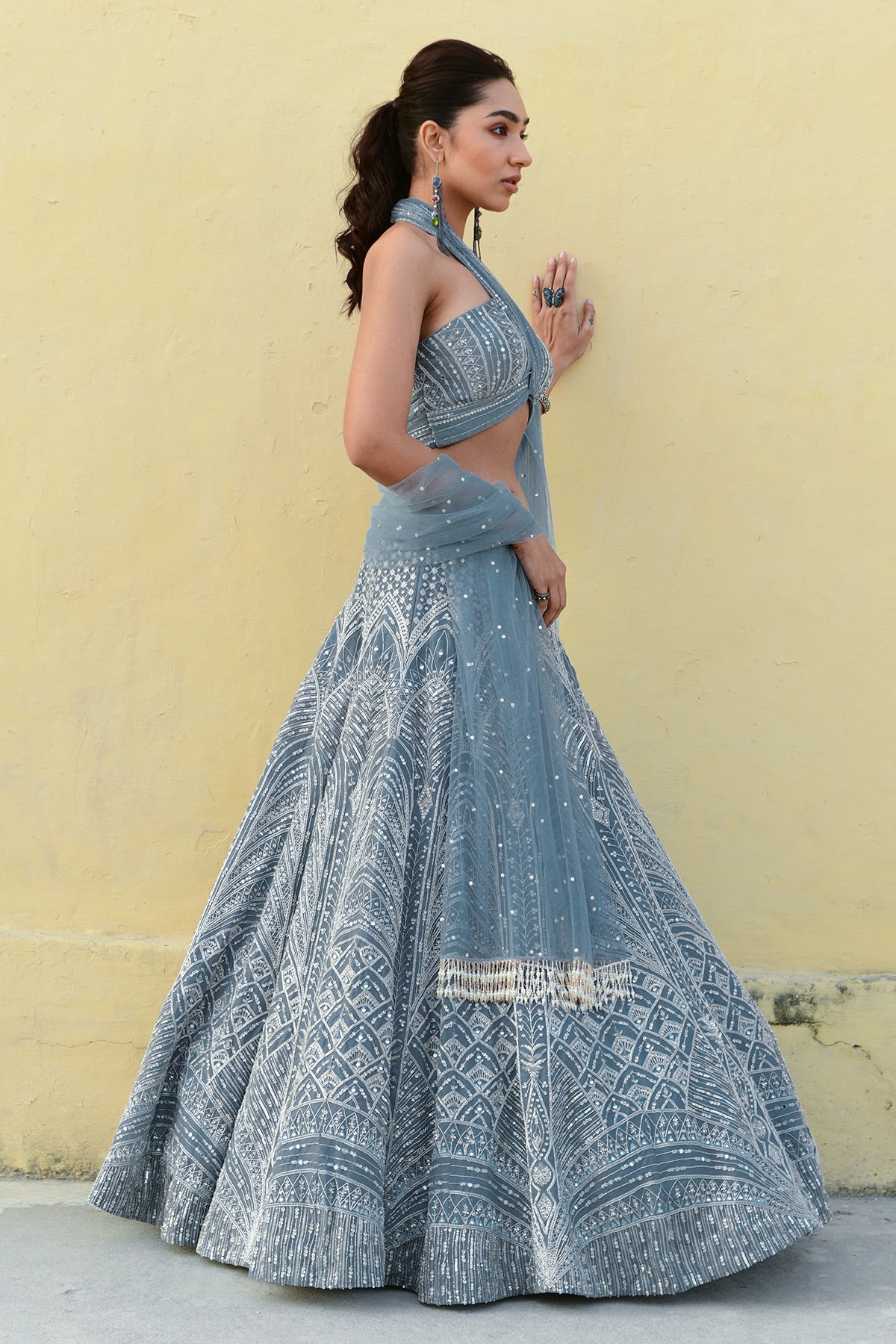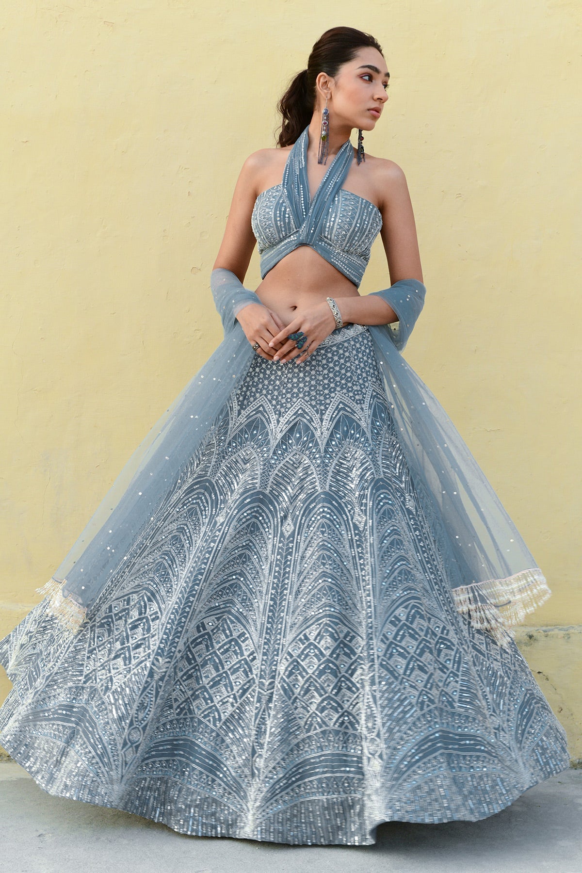 Organza based lehenga embroidered in a geometric fashion with pearls, zardosi, mirror and glass beads. It is paired with a matching ruched halter bralette and a simple tulle dupatta with scattered badla with adorned with long dangling pearl tassel edges