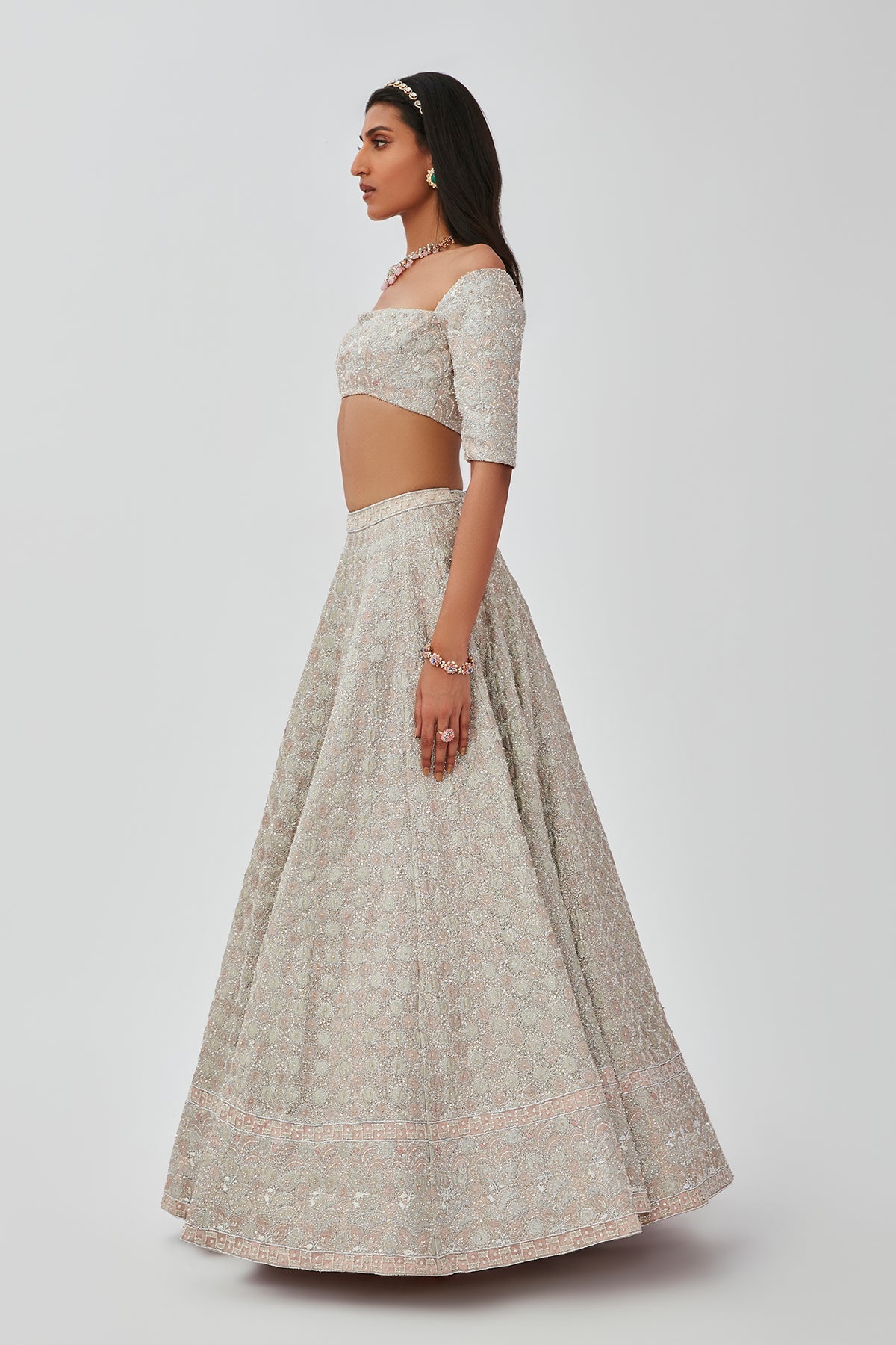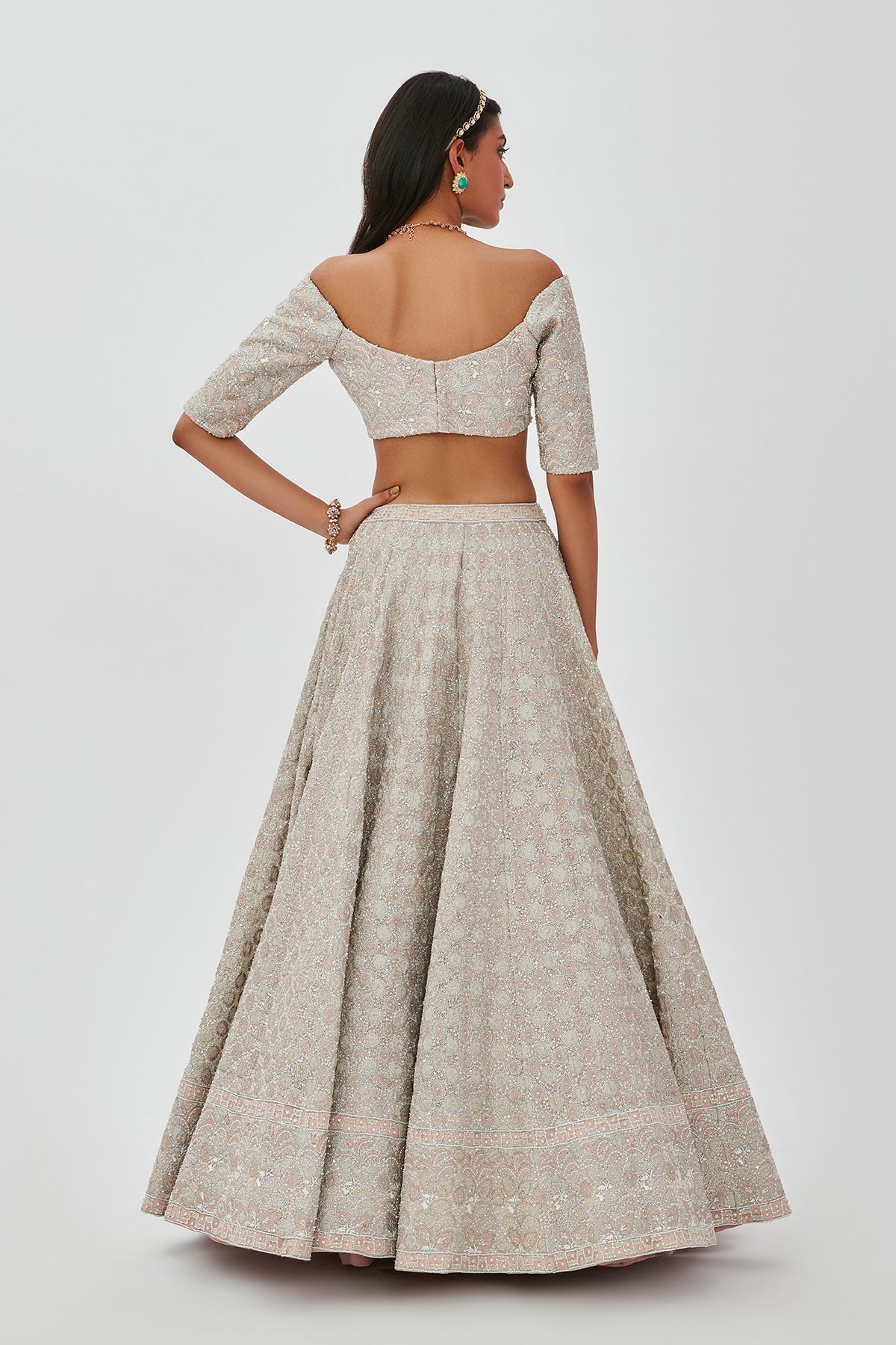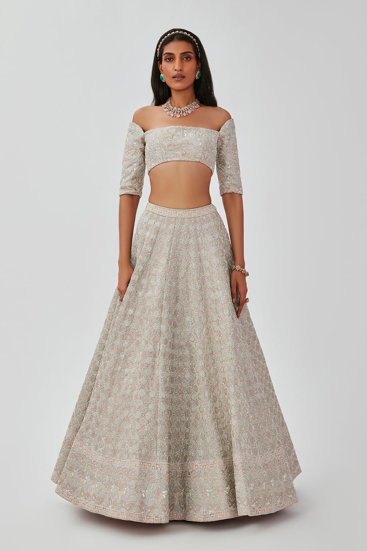 Silver pastel tissue appliqued and heavy embellised net lehenga with off-shoulder blouse and scallop dupatta.