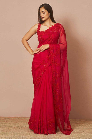 Our signature red organza sheer saree set with intricate cutwork and cutdana adorned Amaryllis saree set.