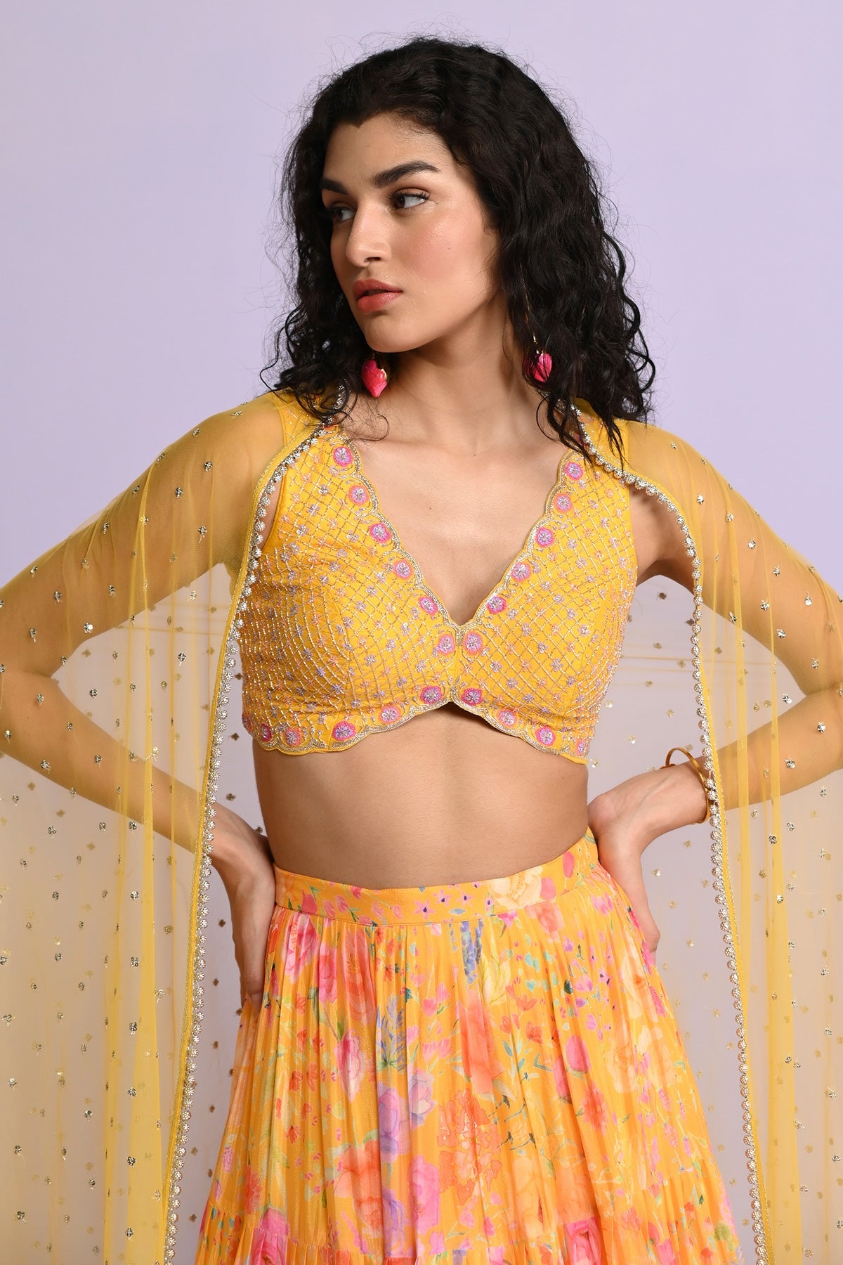 Glassbead And Resham Emroidered Blouse Paired With Floral Tiered Skirt And Tulle Dupatta