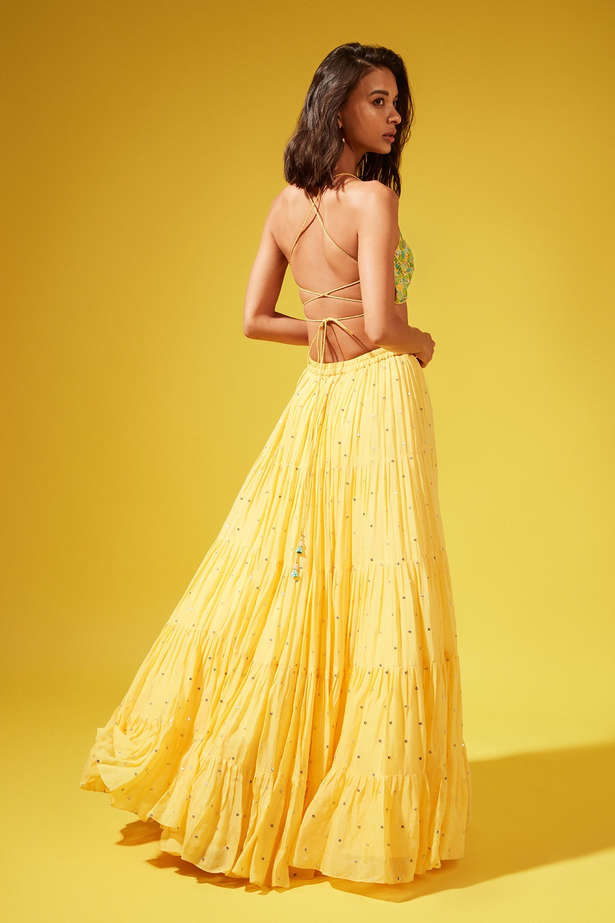Georgette tiered skirt, with silk hand embroidered halter style, backless blouse, paired with a tulle dupatta.