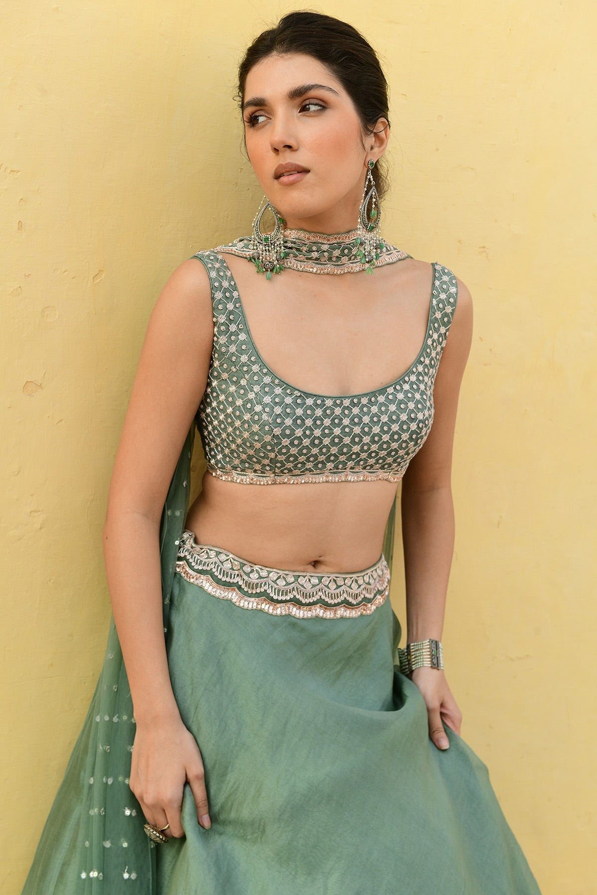 organza based skirt accentured with a hand embroidered waistband paired with a zardosi embroidered blouse and a matching embroidred tulle dupatta