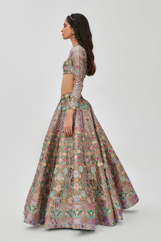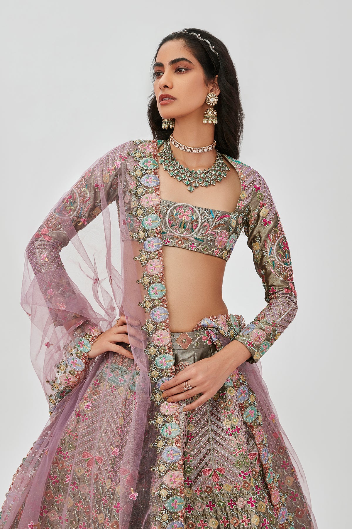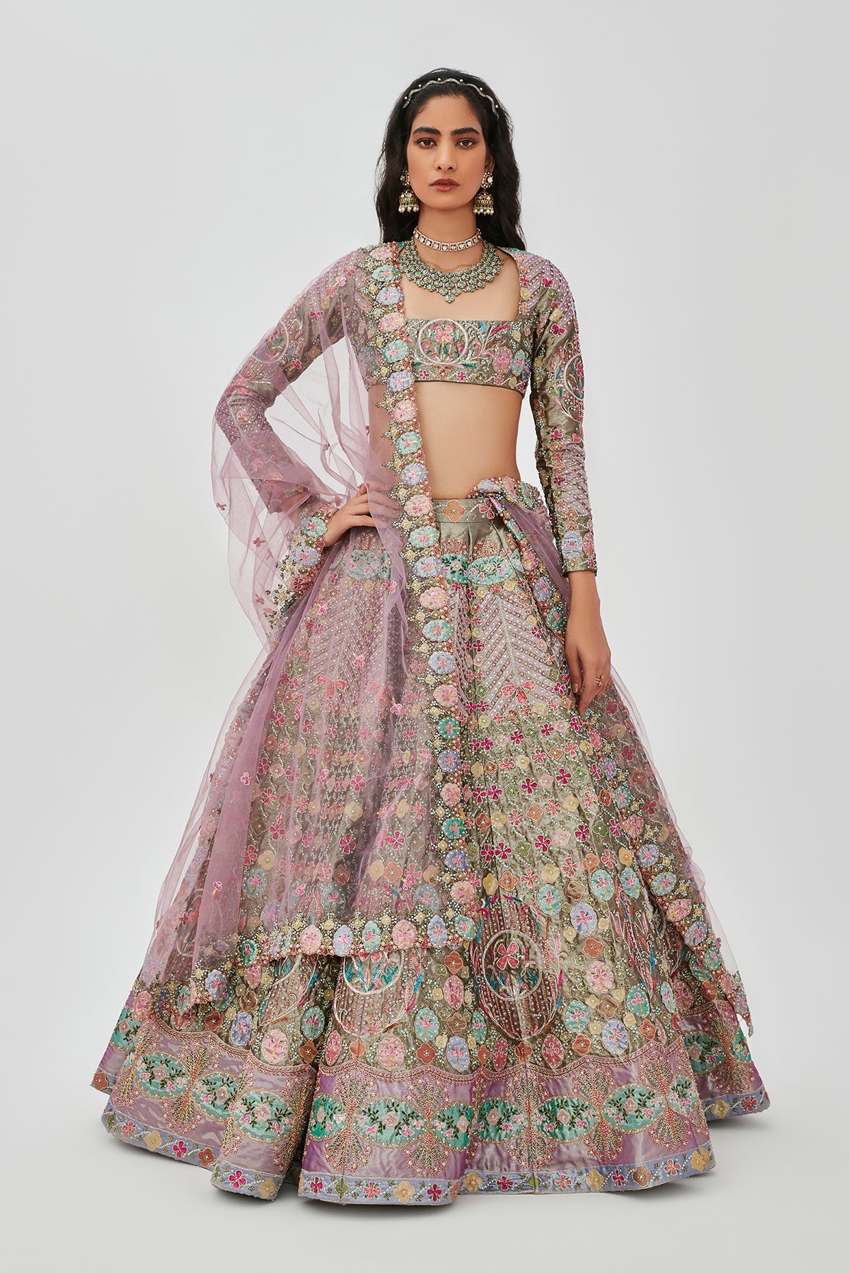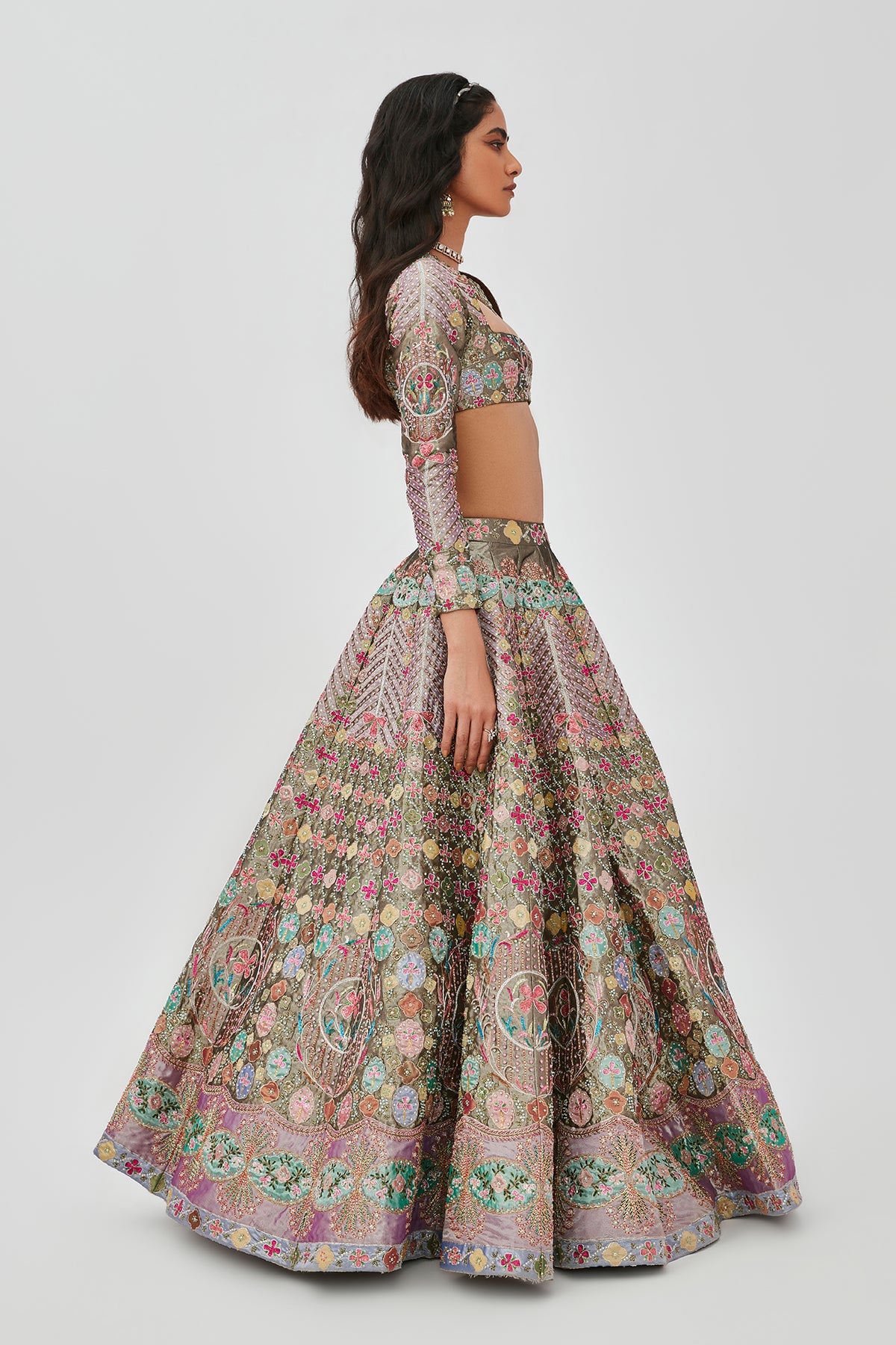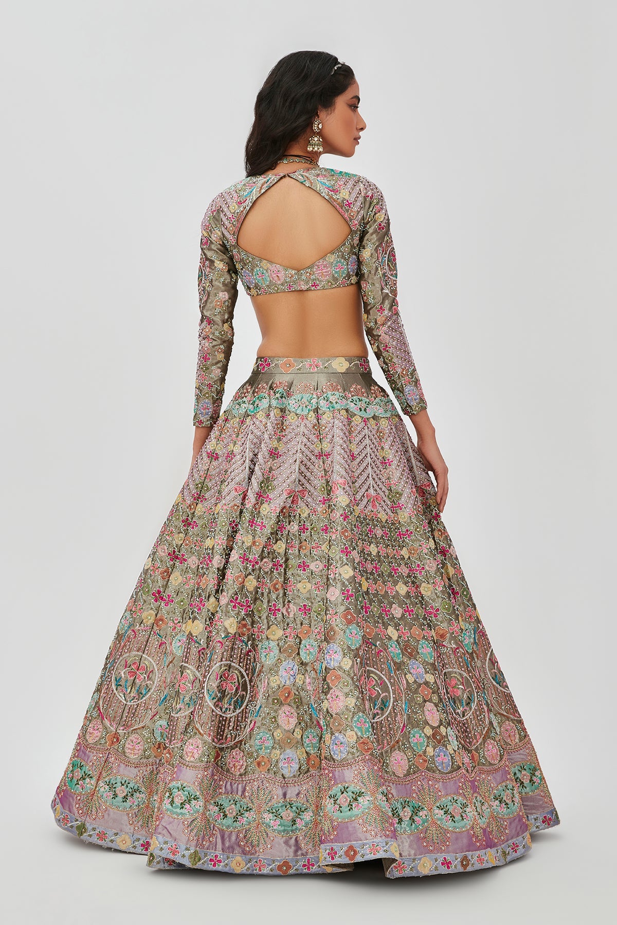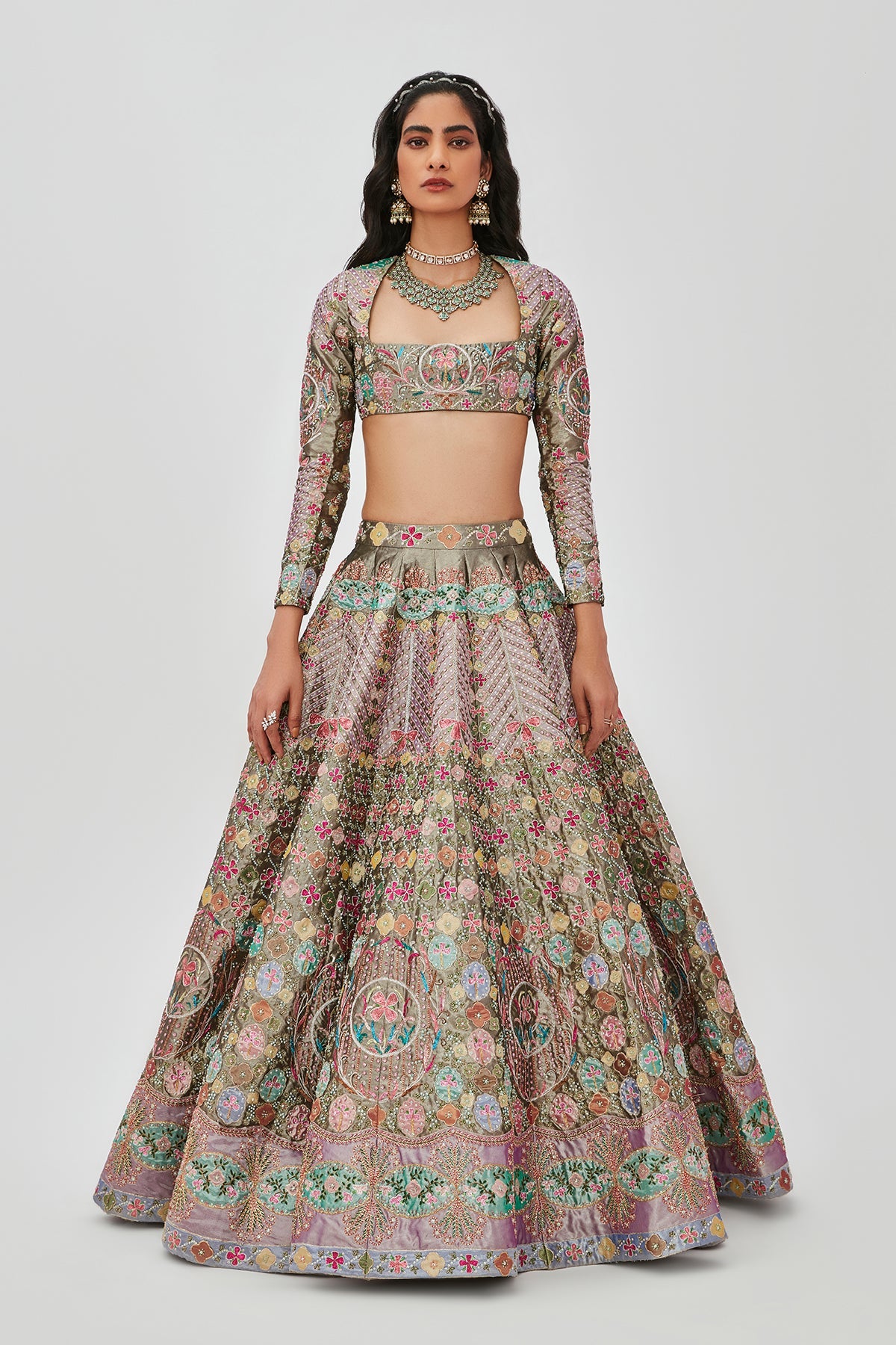 Multicolour Light grey heavy embellished and appliqued kali Tissue border lehenga with full sleeve blouse & dupatta.