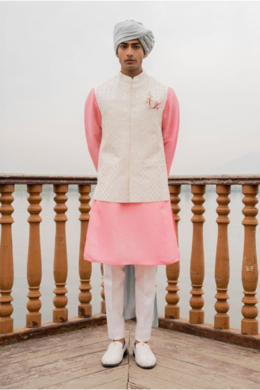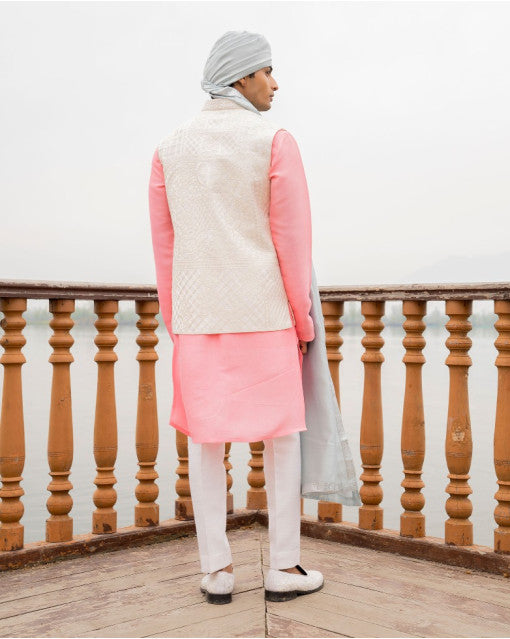 - LIGHT PEACH, RAW SILK BANDI WITH INTRICATE TRADITIONAL MOTIFS IN IVORY THREADWORK DETAILS, AND TEAMED WITH A MELON PINK SILK KURTA AND IVORY TROUSERS.