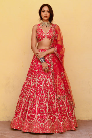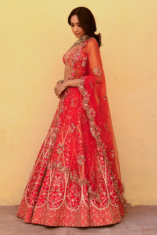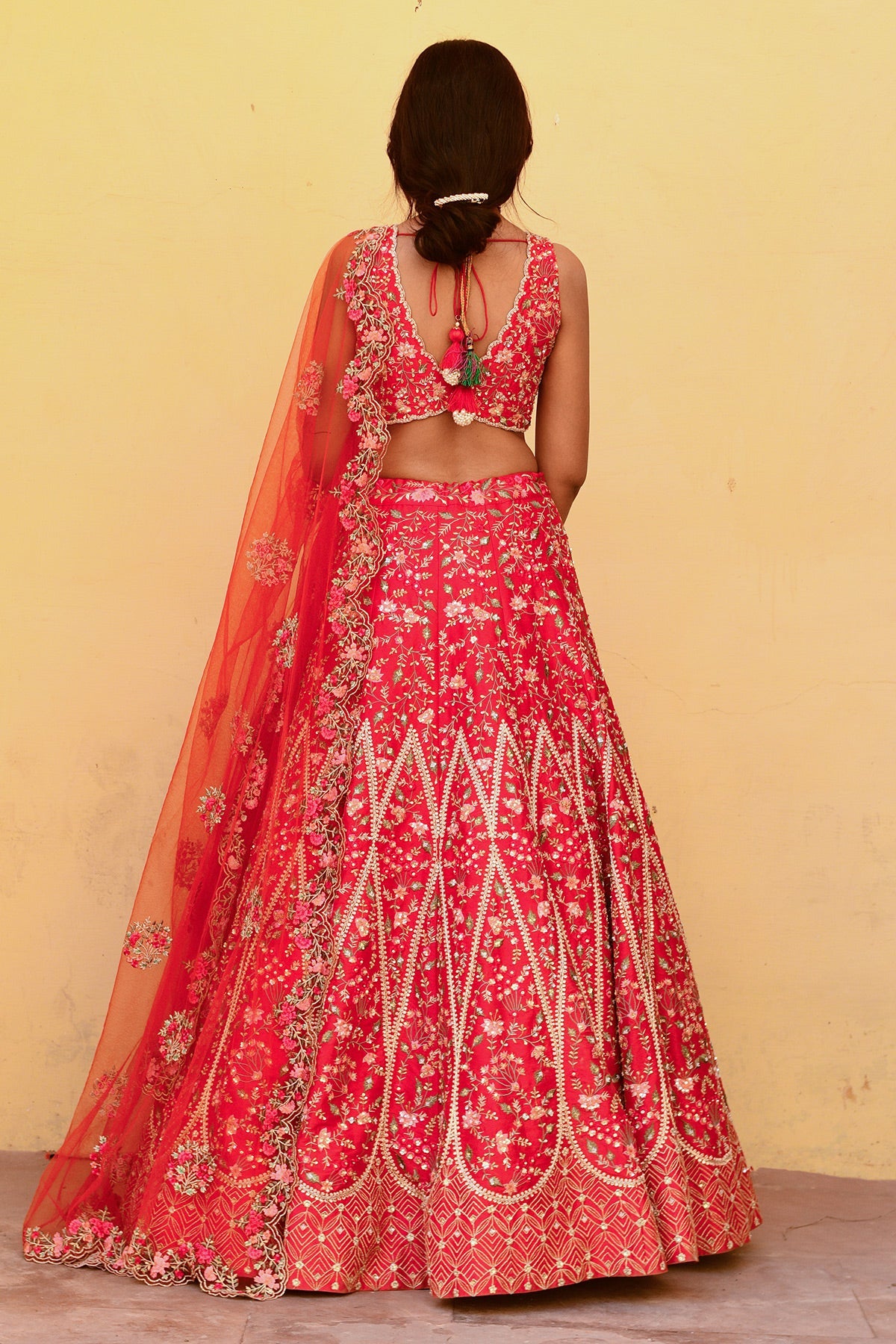 Silk based lehenga with multiple hued thread work highlighted with pearls, kundan and sequence paired with a matching jaal blouse with an accentured neckline and a delicately embroidered scallop-edged dupatta with floral motifs scattered throughout.
