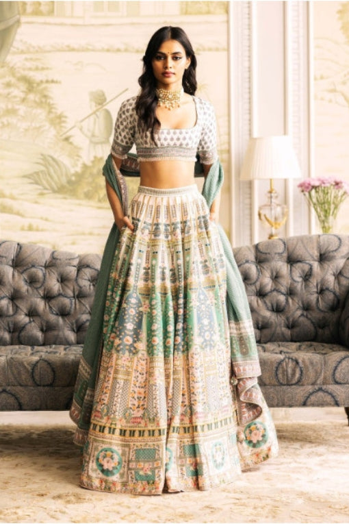 - PASTEL GREEN, MULTICOLOURED LEHENGA WITH PRINTED TRADITIONAL AND FLORAL MOTIFS. THE LEHENGA SKIRT IS PAIRED WITH AN IVORY BLOUSE ADORNED WITH TASSELS; STYLED WITH A BORDERED ORGANZA DUPATTA.