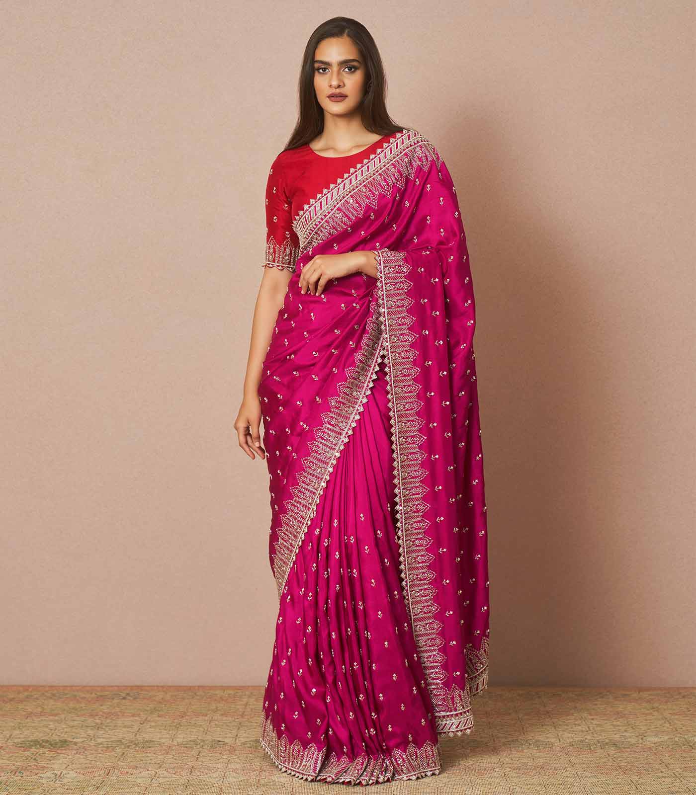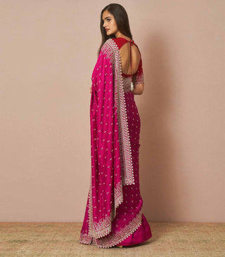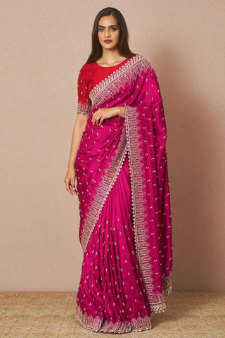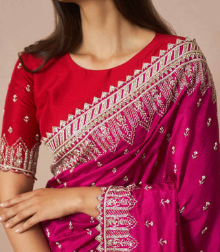 Cherry pink Avalin is a silk saree set adorned with all over Chitta embroidery with a heavy border embroidered with cutdana.